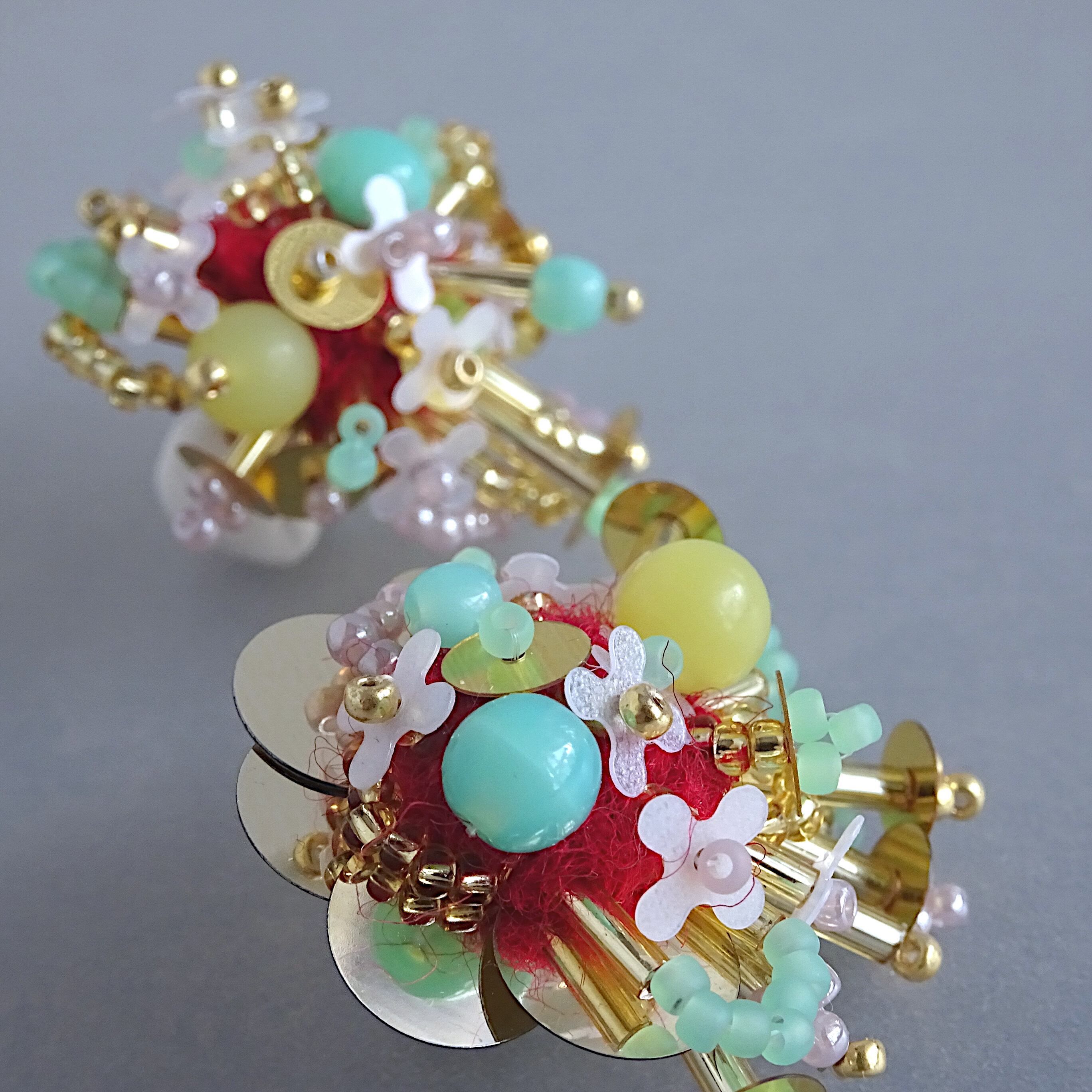 耳飾りはのびやかで不規則で生き物らしい造形とキッチュな愛らしさに溢れます。
