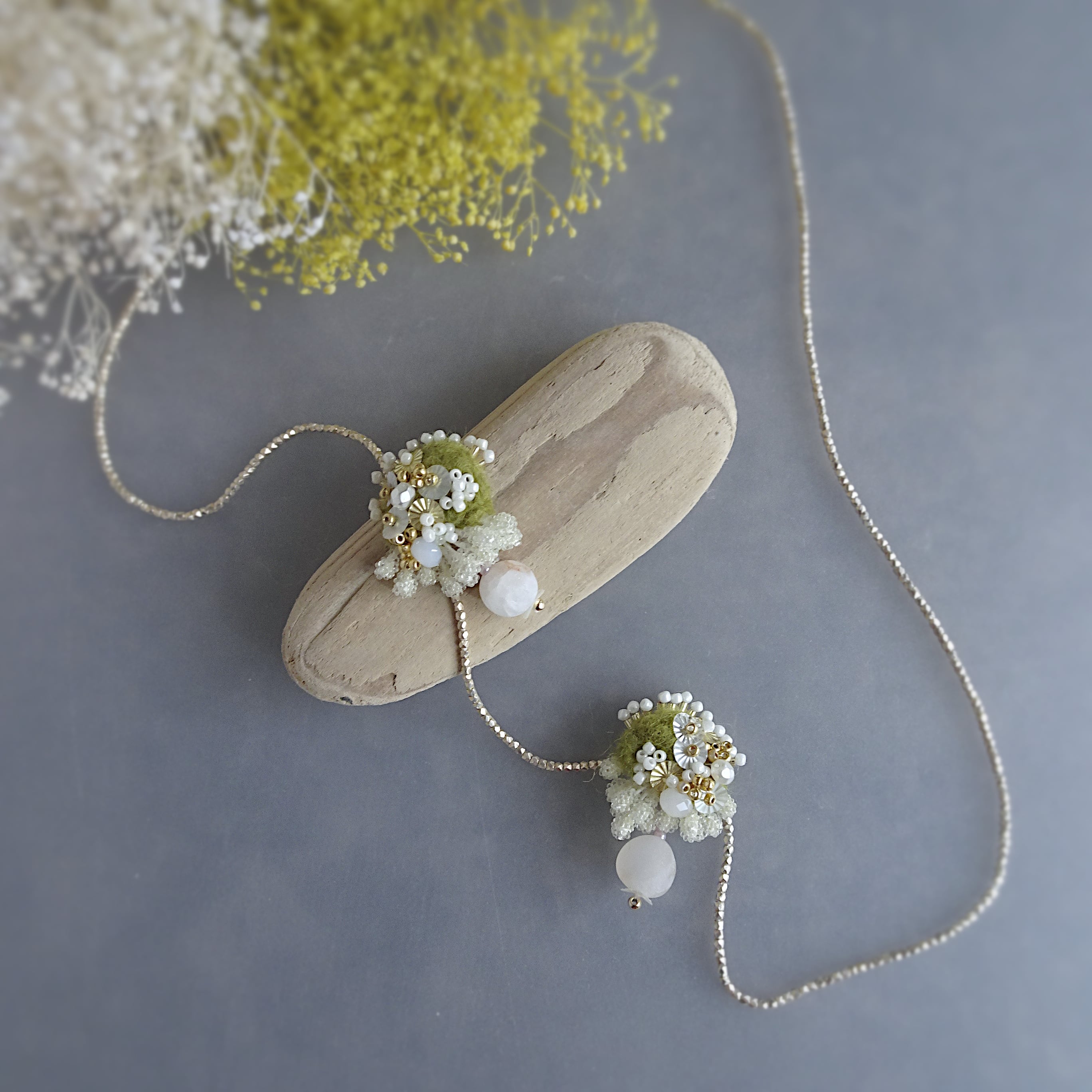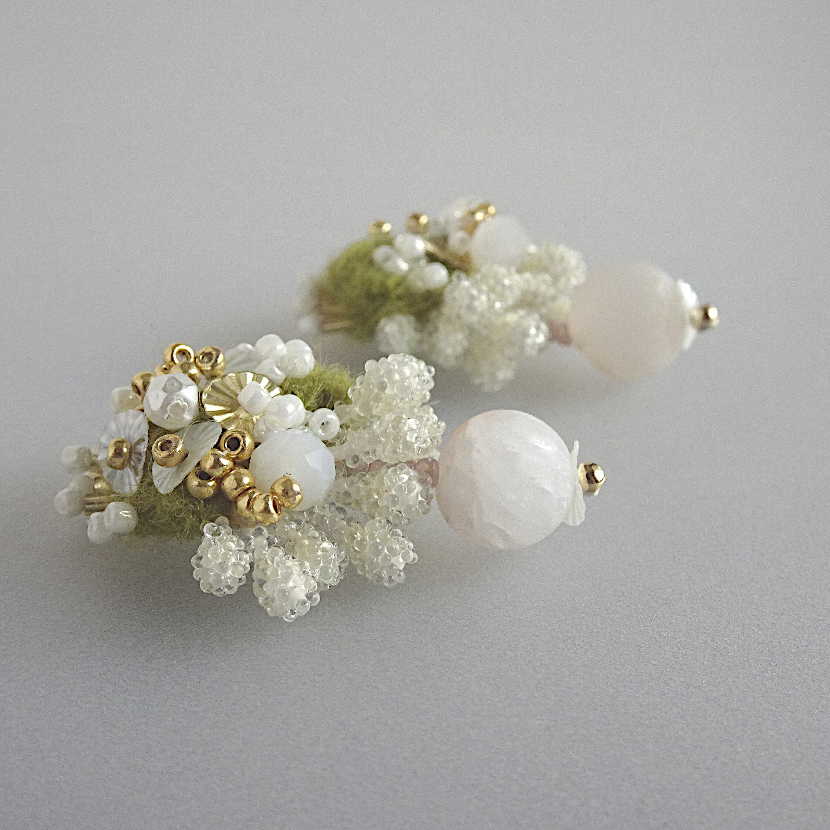 ゴールドのビーズやダイヤモンドカットの白ビーズが随所に刺繍されたラグジュアリーな耳飾りです。