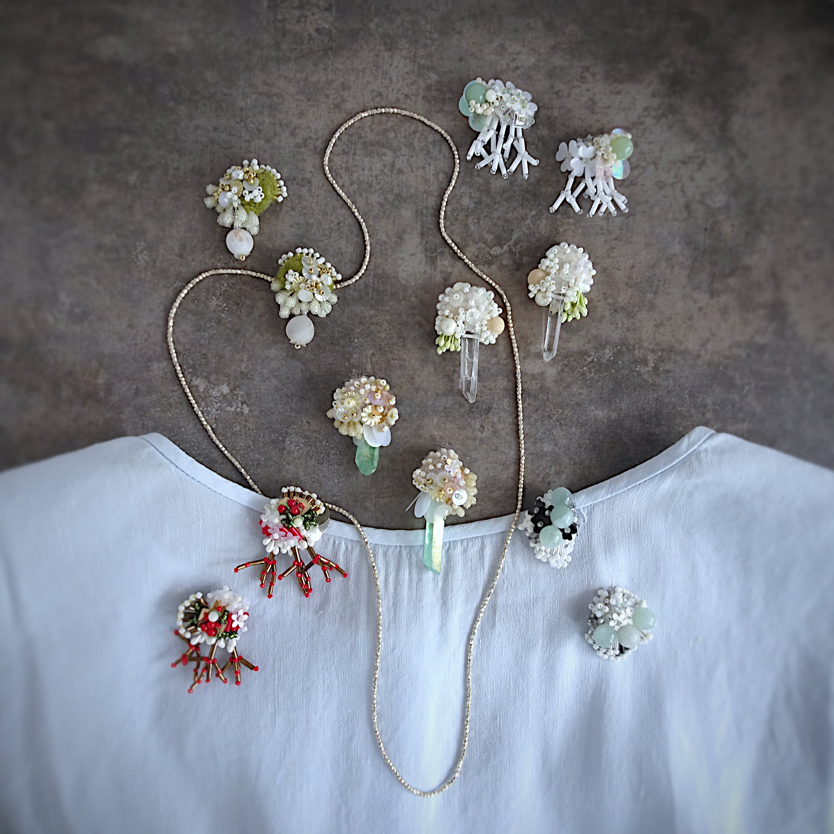 結晶の模様がしっとりと美しい、透明感のあるトレジャーストーンが華やかな刺繍に添えられています。