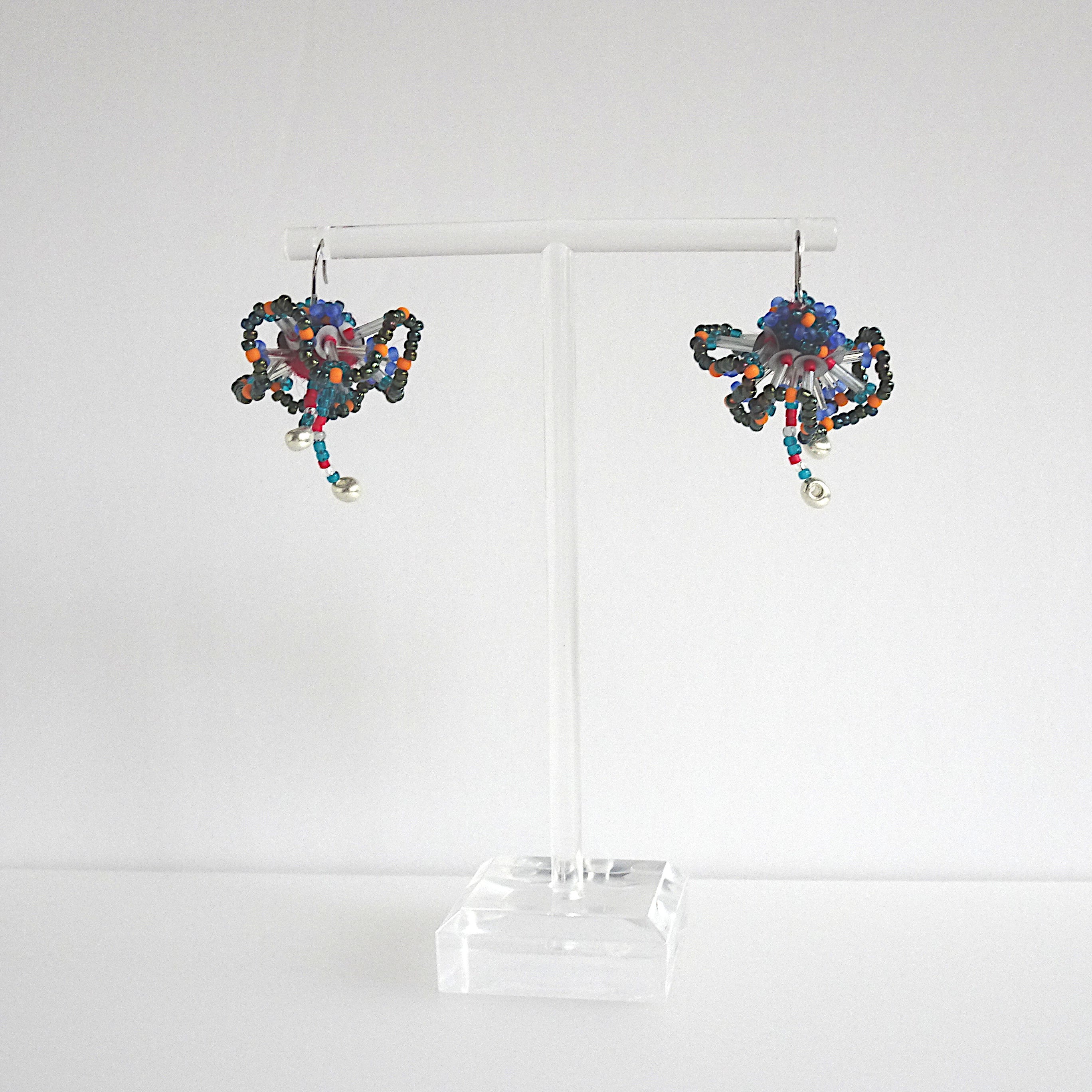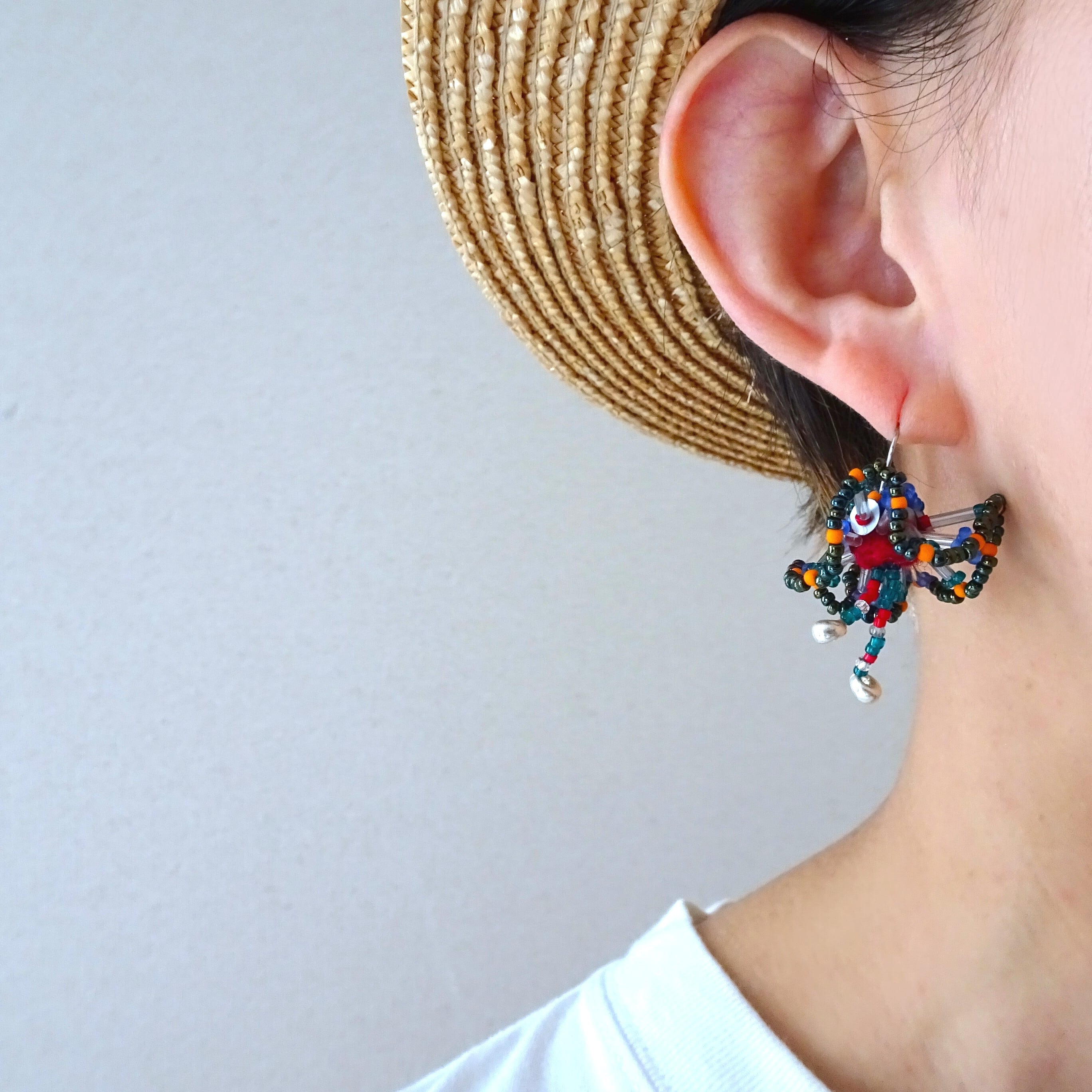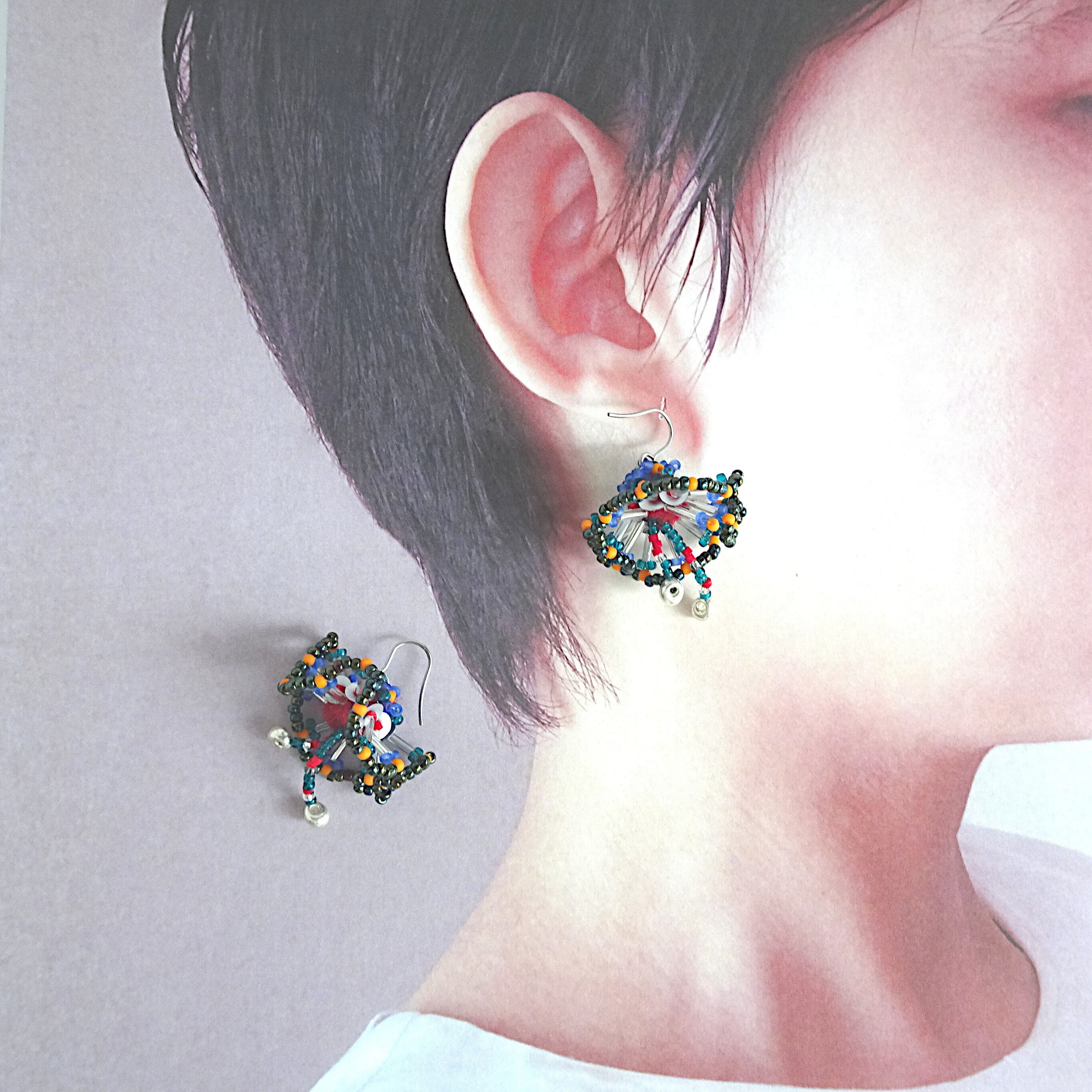 落ち着いた玉虫カラーのビーズをメインに、赤や緑がかった青ビーズ、マットオレンジをちりばめました。クラゲの先端にはマットなシルバービーズを縫い付けて、さり気ない上質感が漂います。