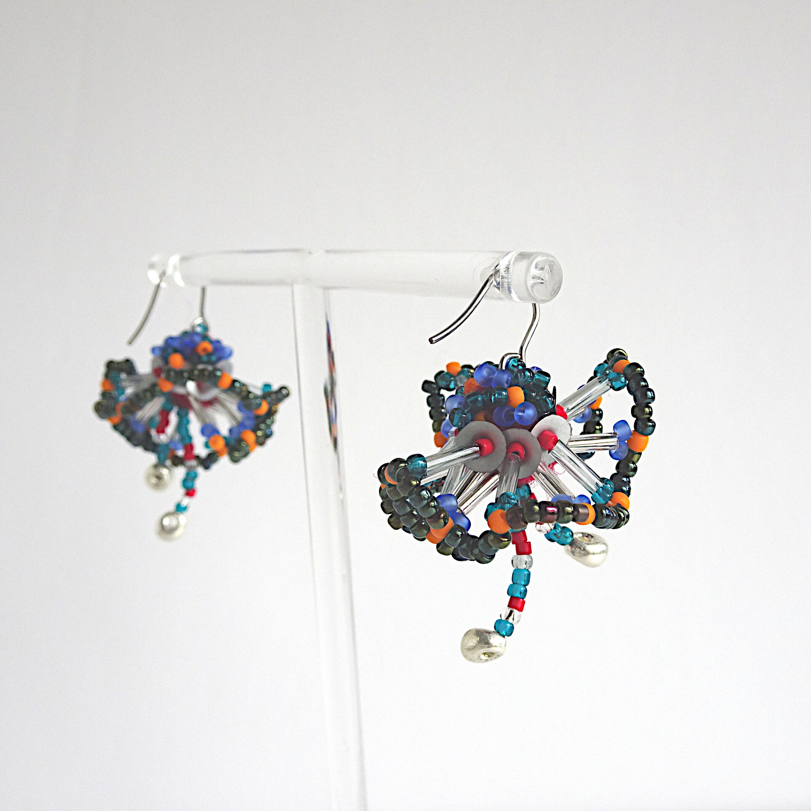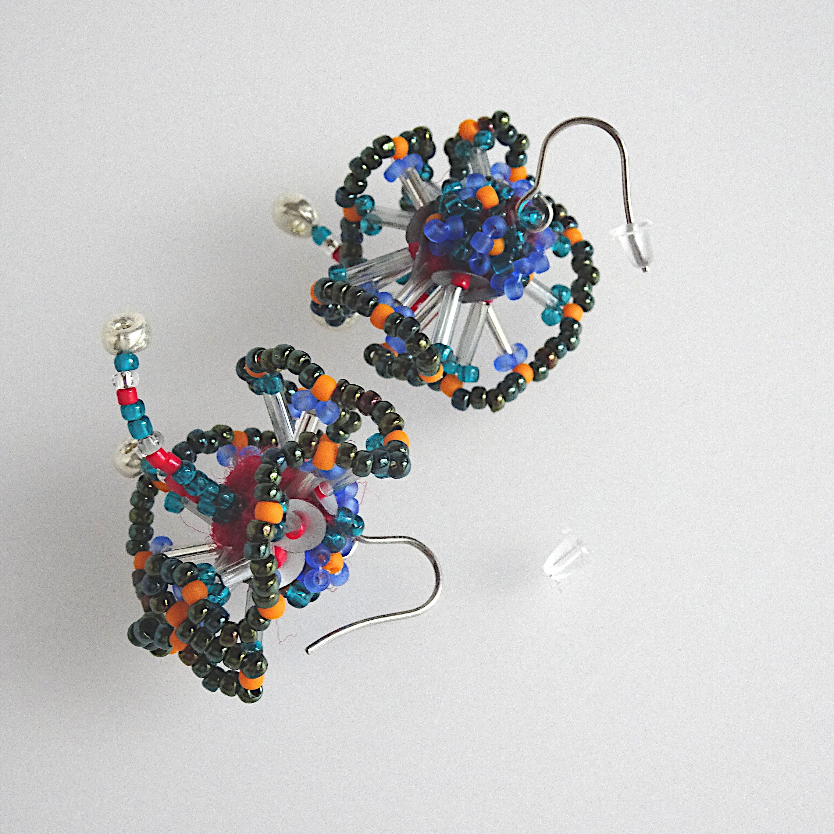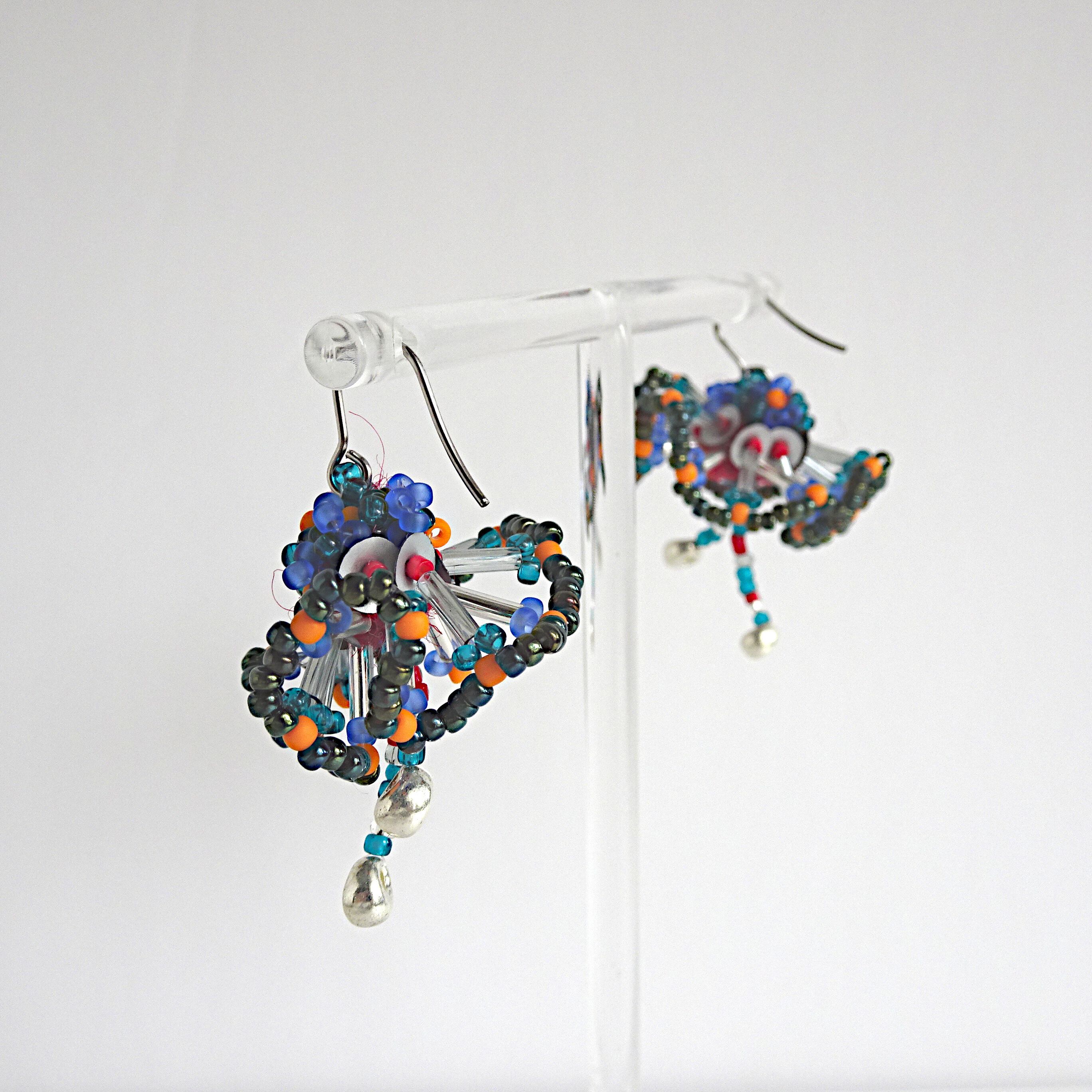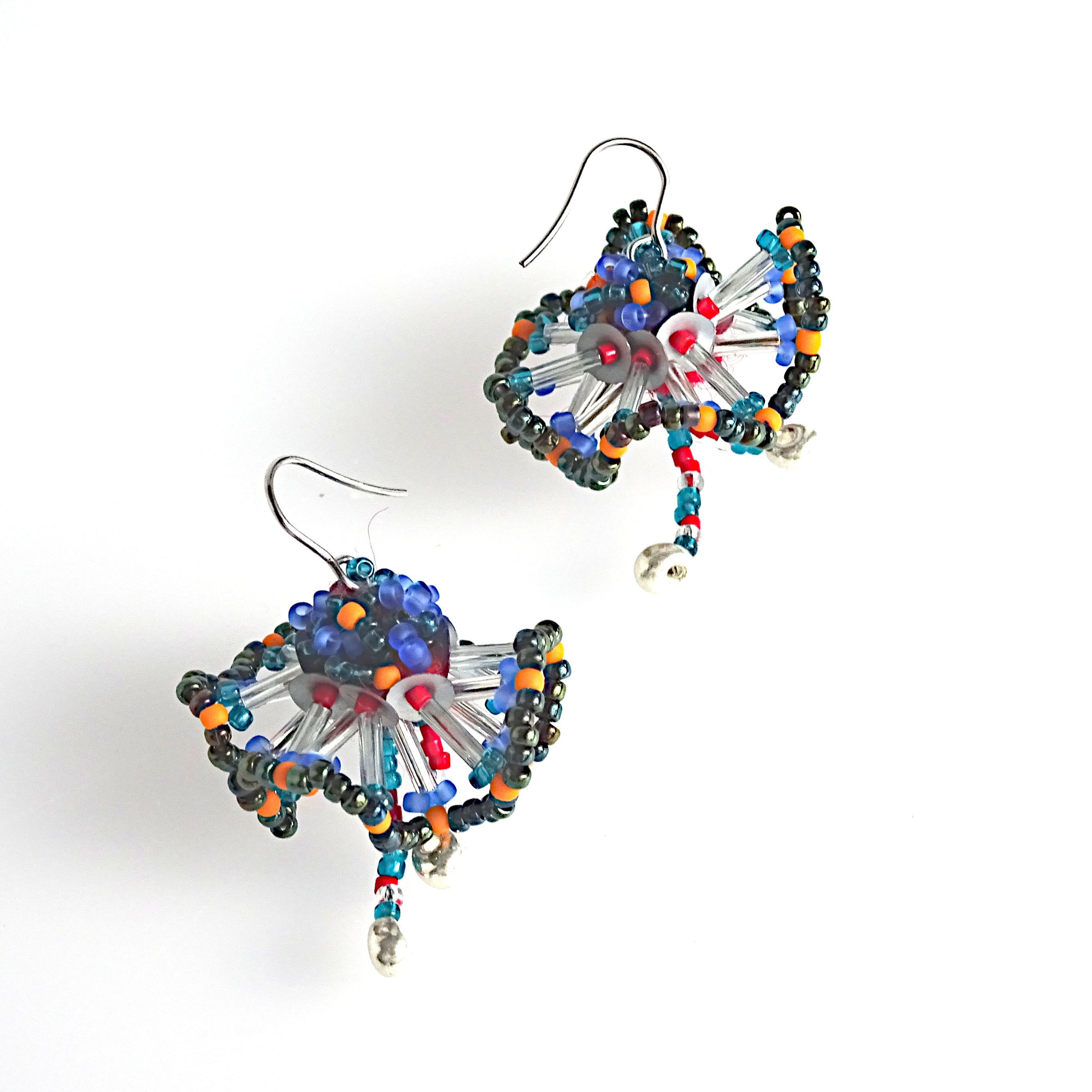 落ち着いた玉虫カラーのビーズをメインに、赤や緑がかった青ビーズ、マットオレンジをちりばめました。クラゲの先端にはマットなシルバービーズを縫い付けて、さり気ない上質感が漂います。