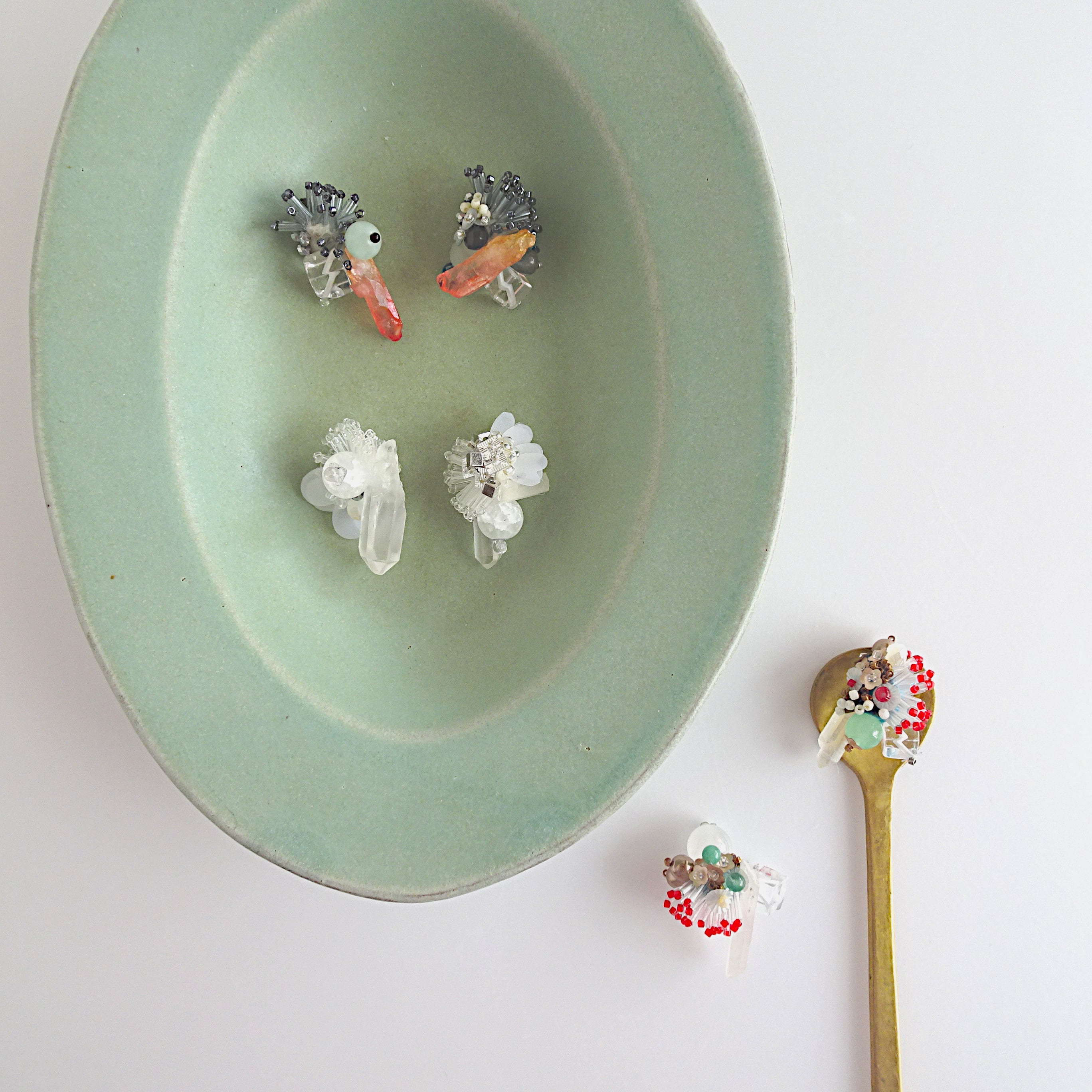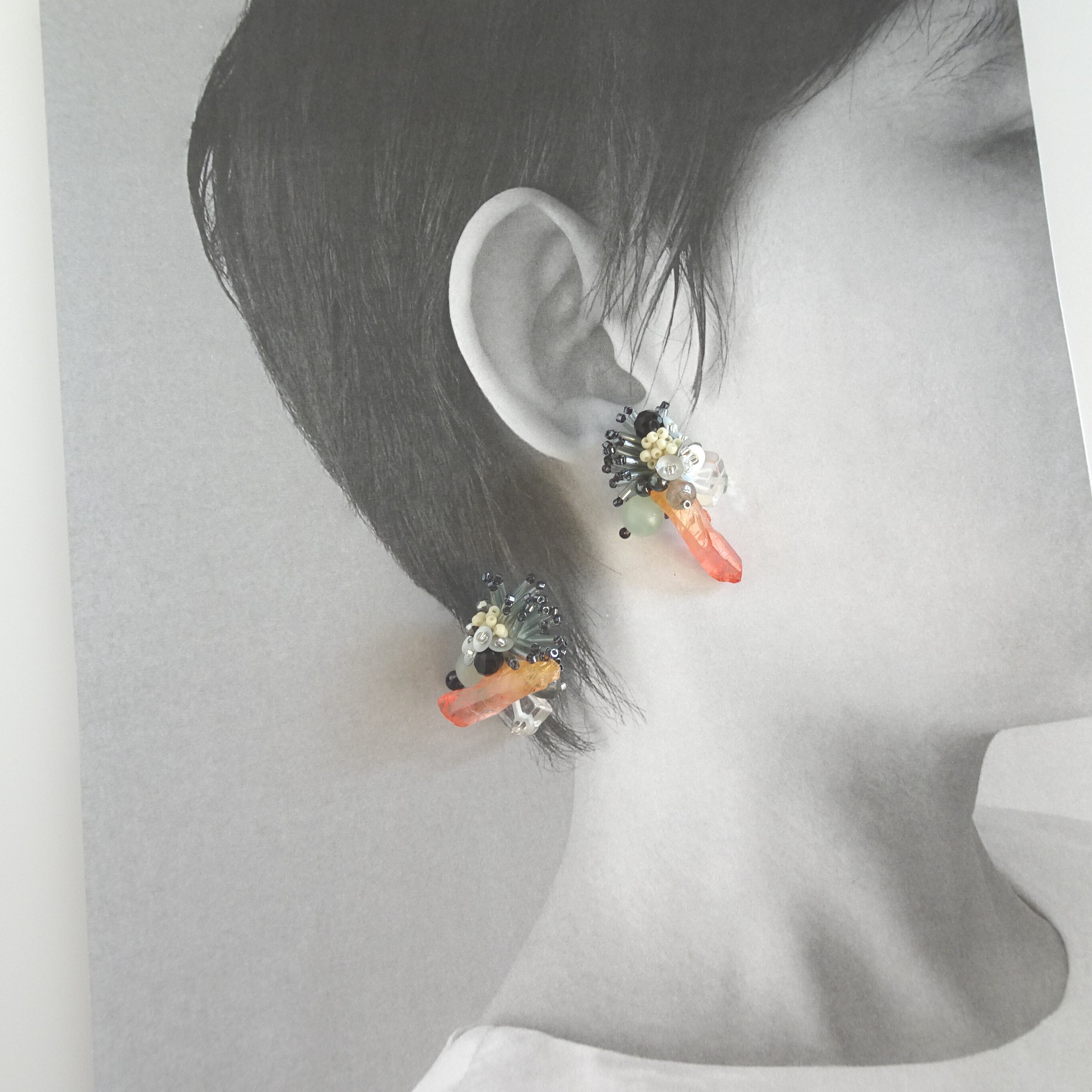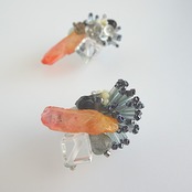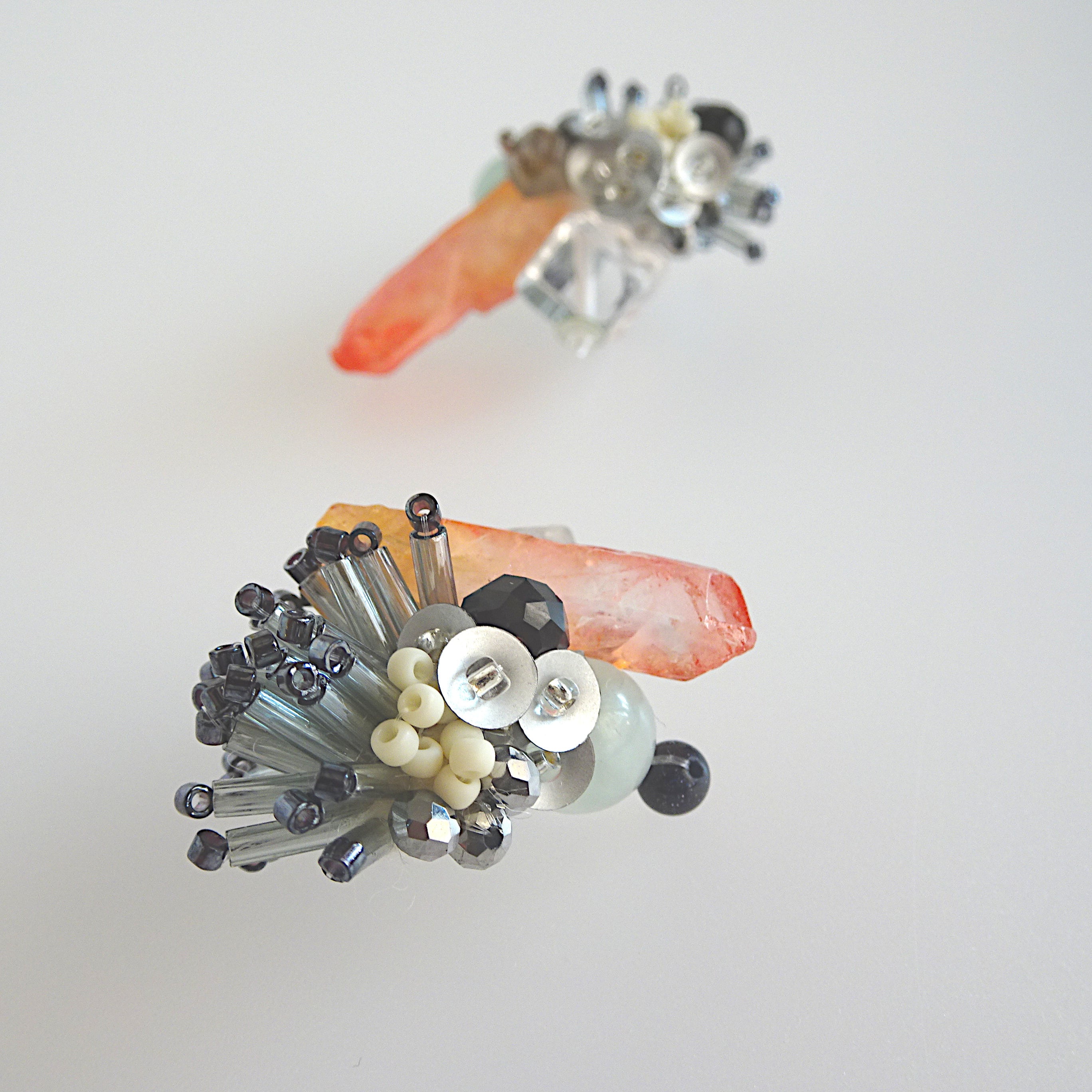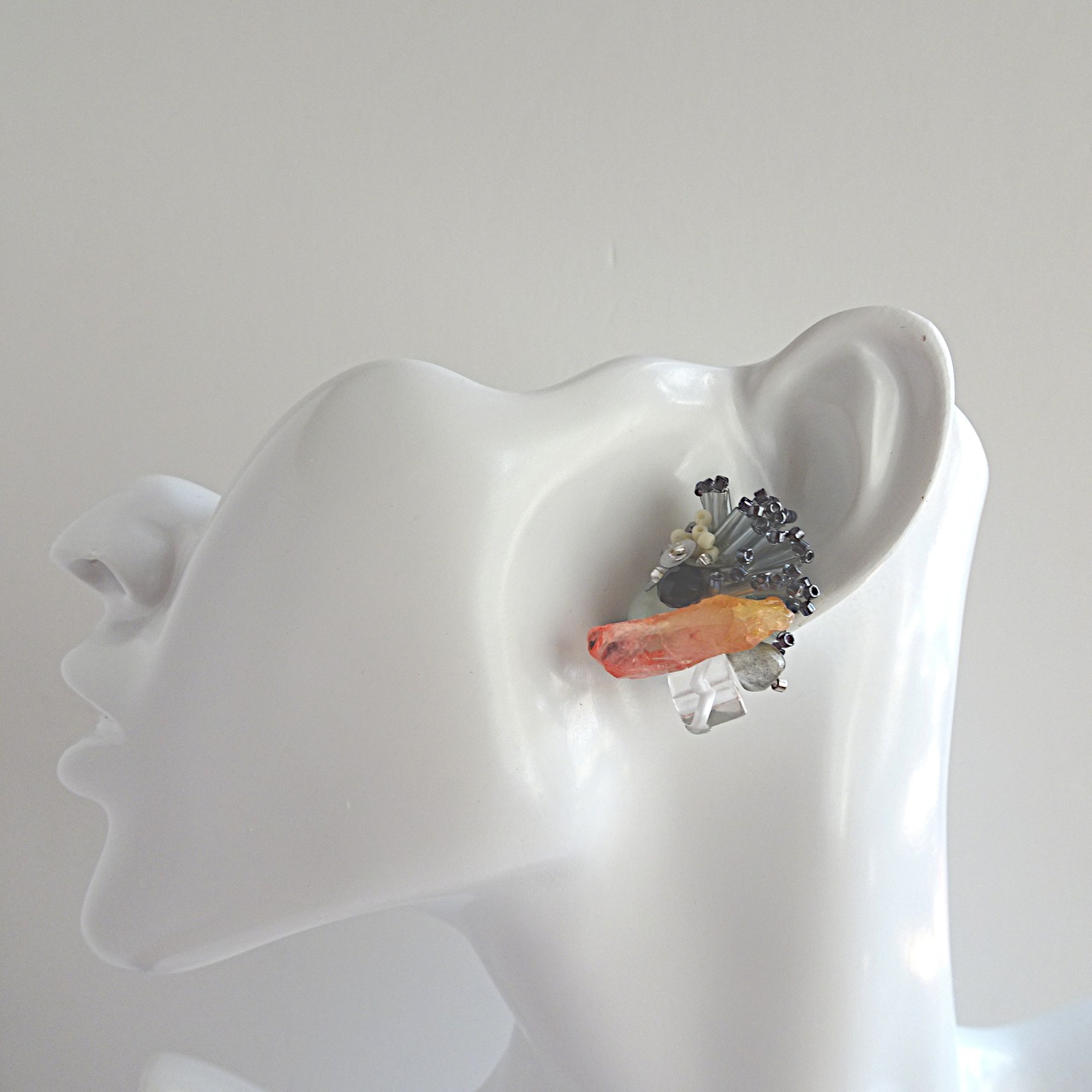 氷柱水晶と球体の天然石、ビーズ刺繍を組合わせて作った立体的なモザイク模様の耳飾り。