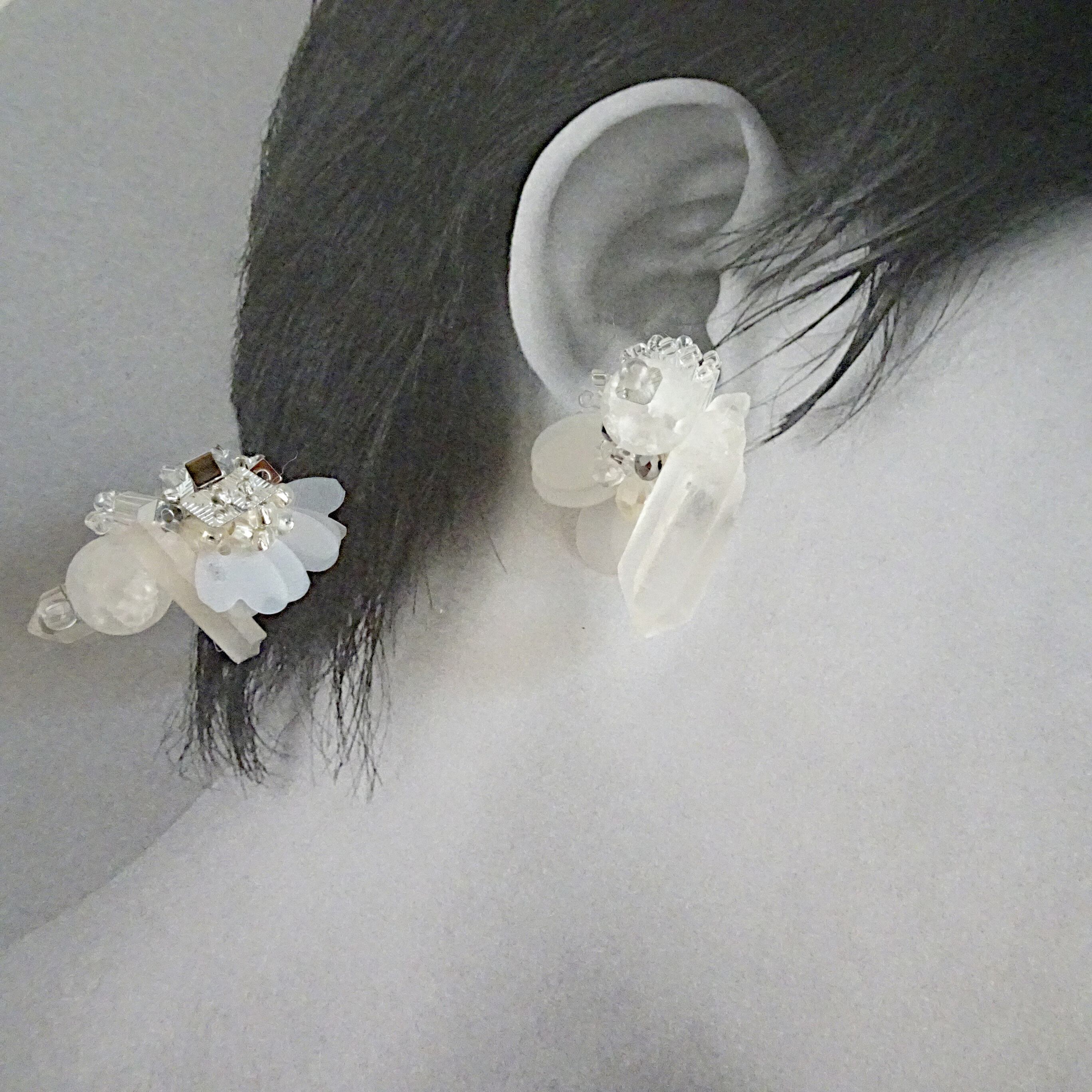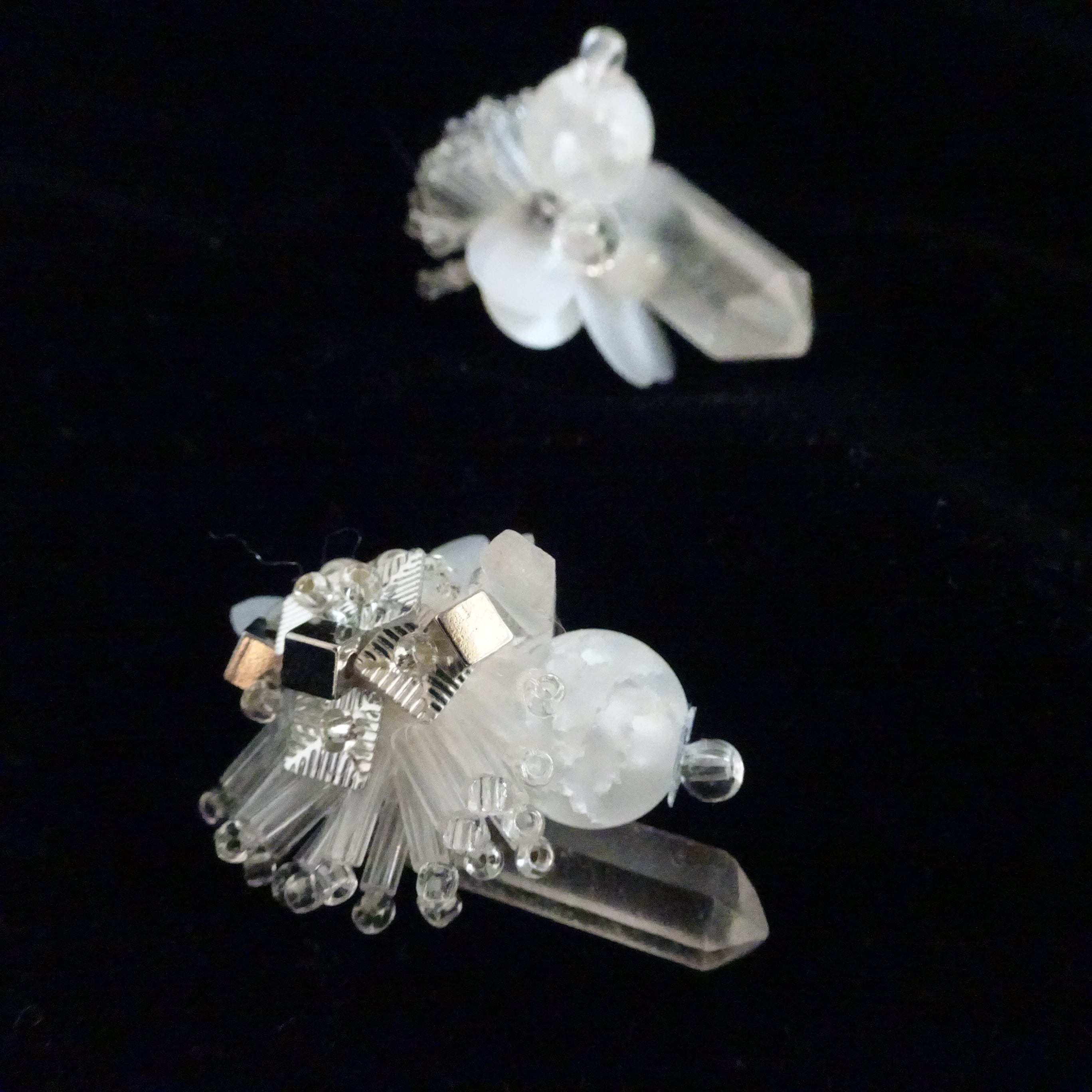 氷柱水晶と球体の天然石、ビーズ刺繍を組合わせて作った立体的なモザイク模様の耳飾り。