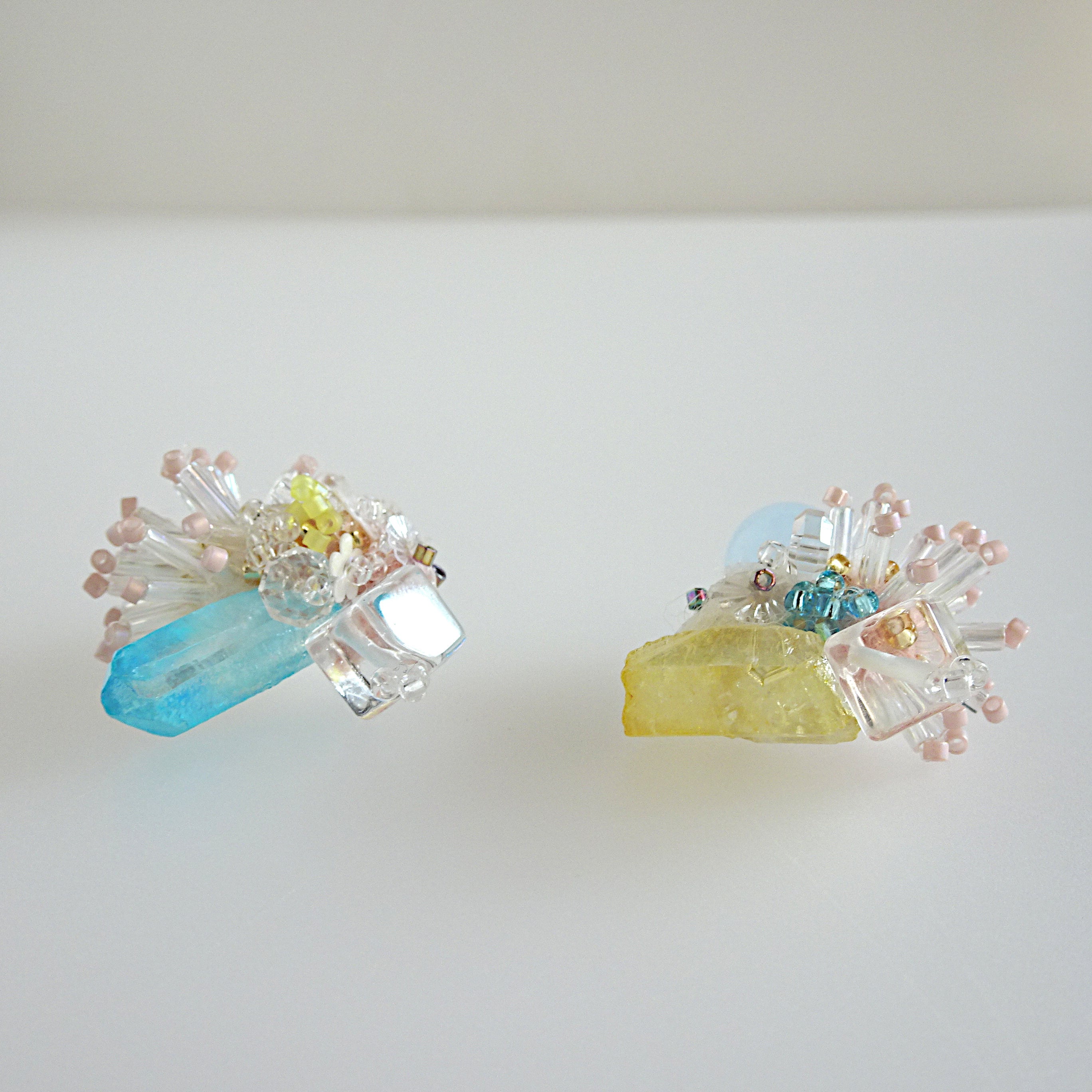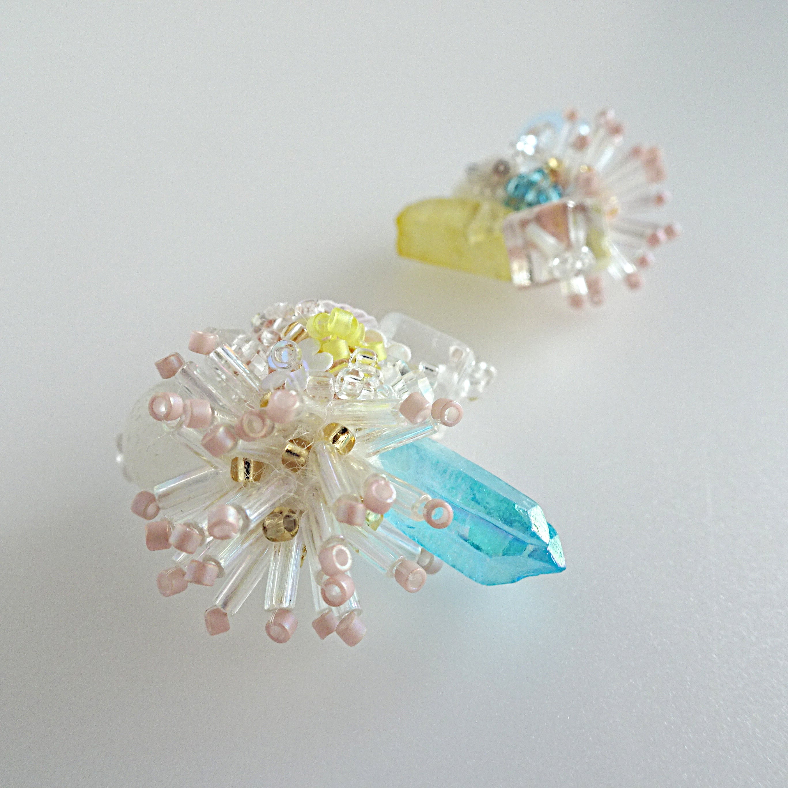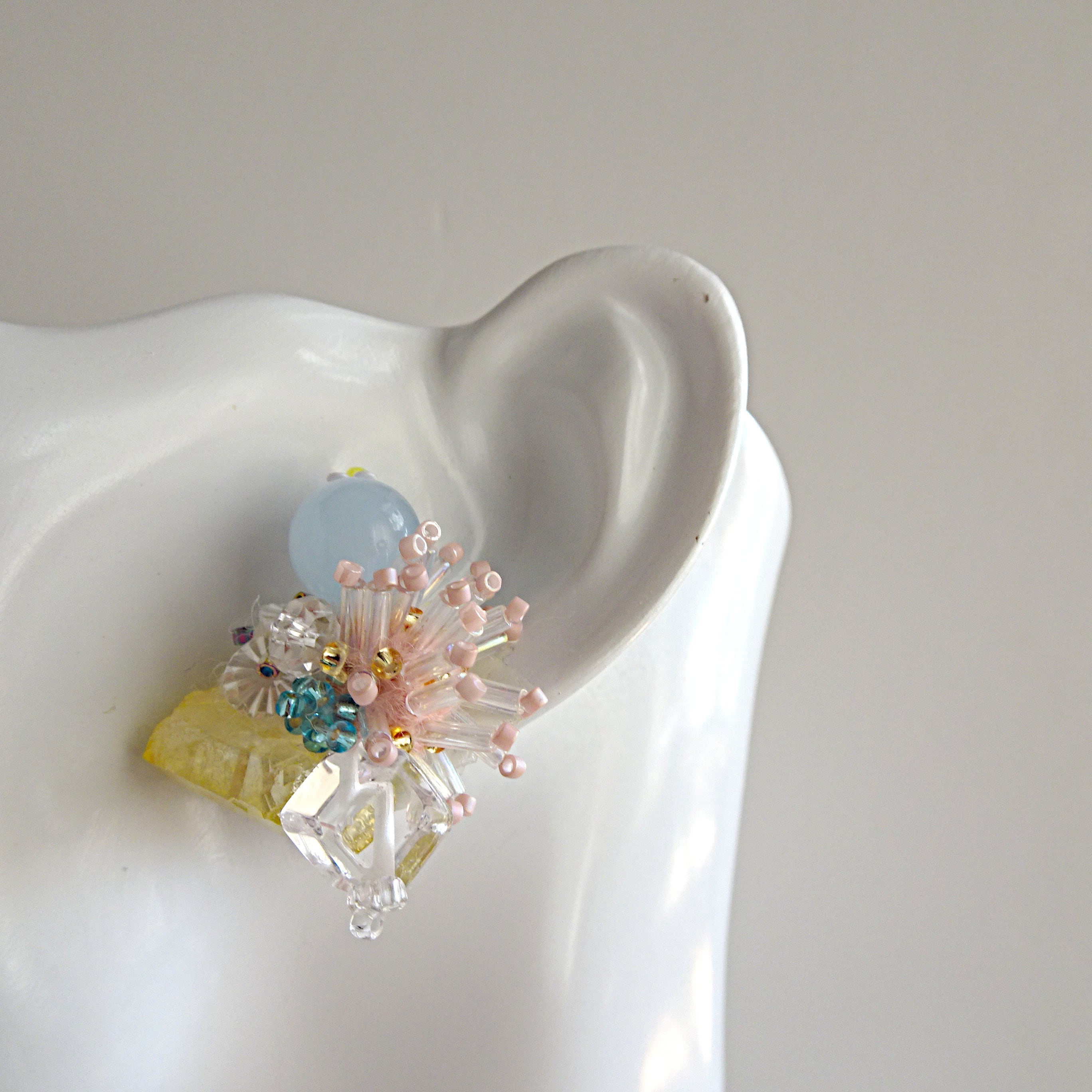 氷柱水晶と球体の天然石、ビーズ刺繍を組合わせて作った立体的なモザイク模様の耳飾り。