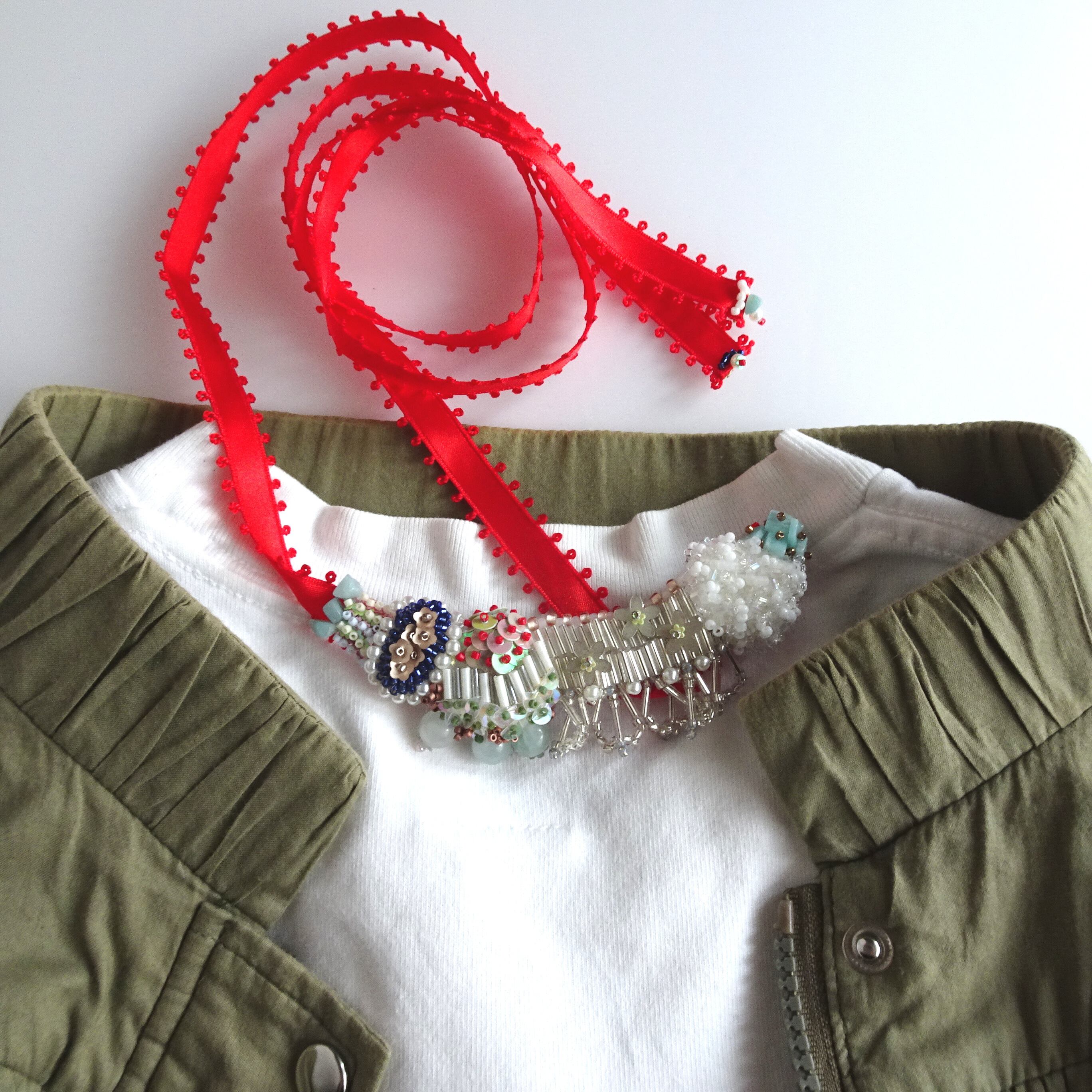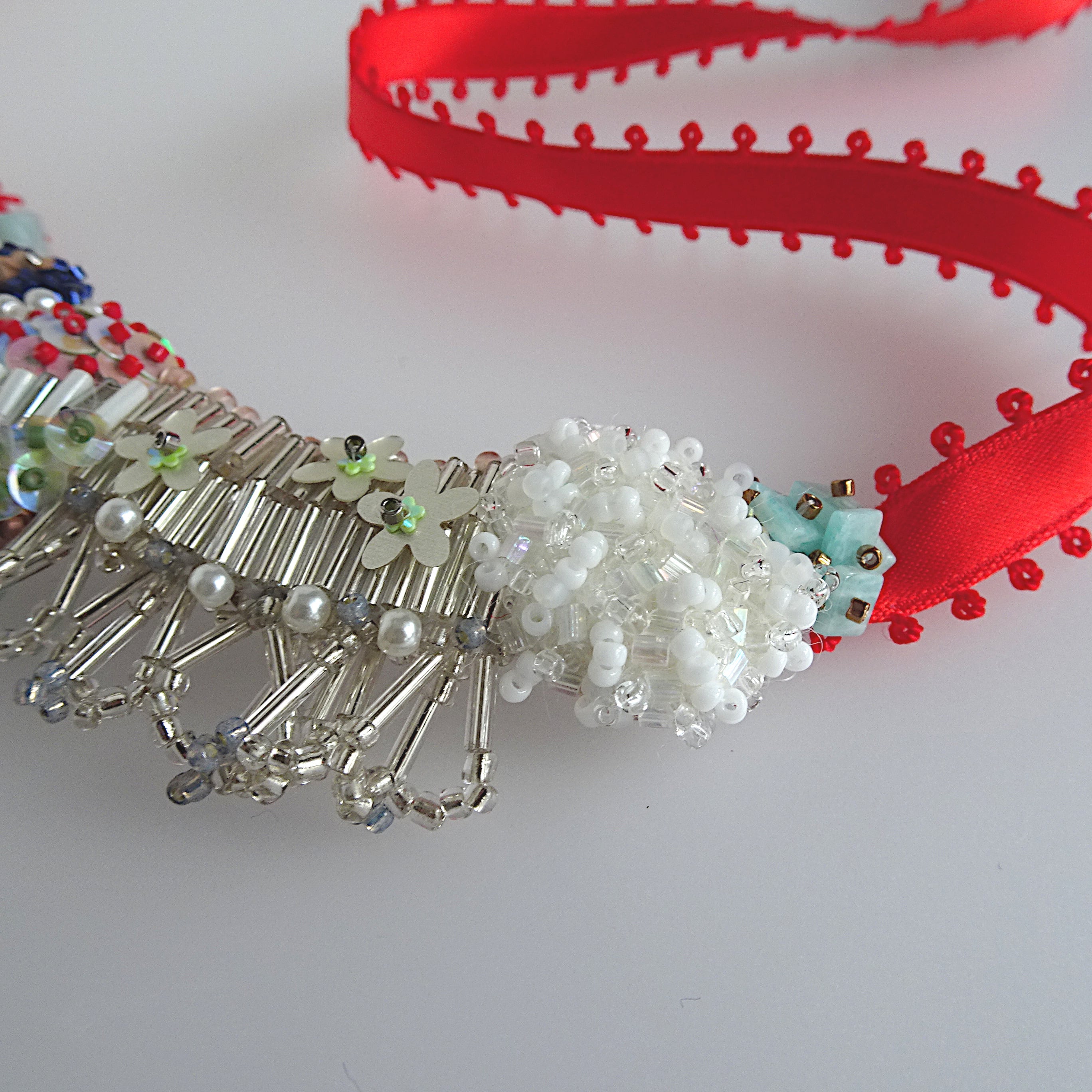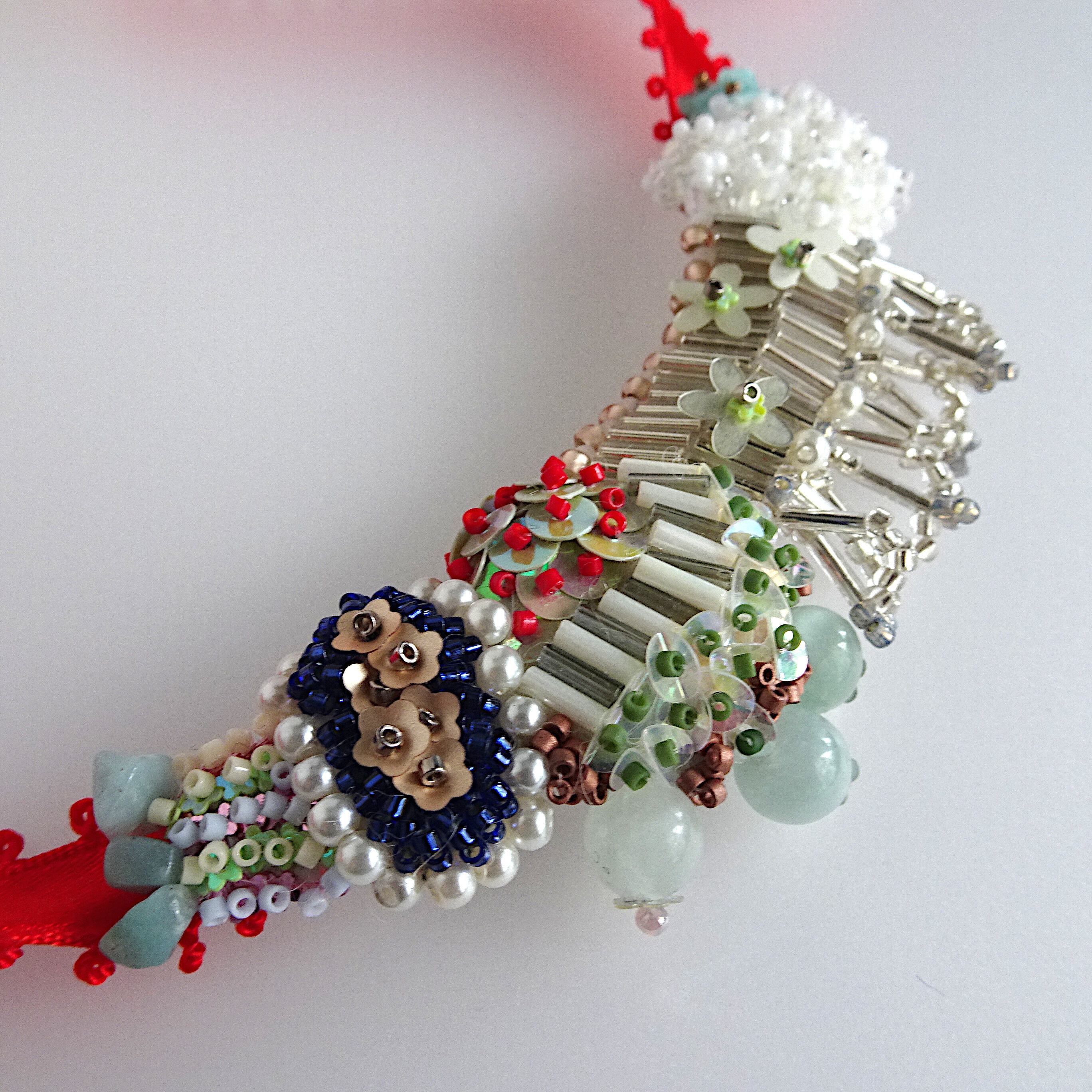 床に広げた私だけの『宝石たち』。その中でもとびきりを並べてつないだ立体刺繍ネックレスをお楽しみくださいませ。