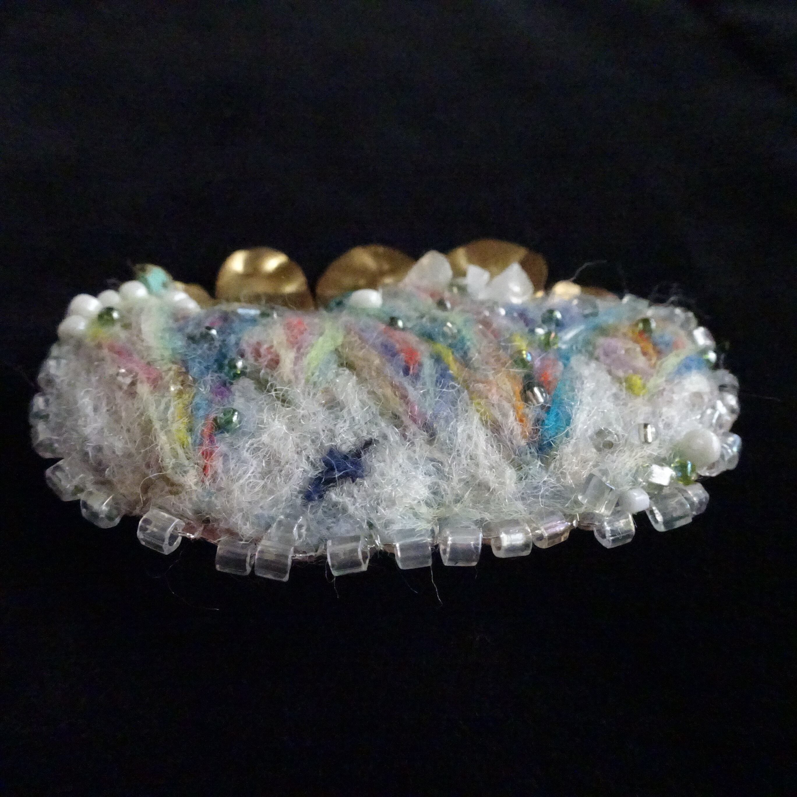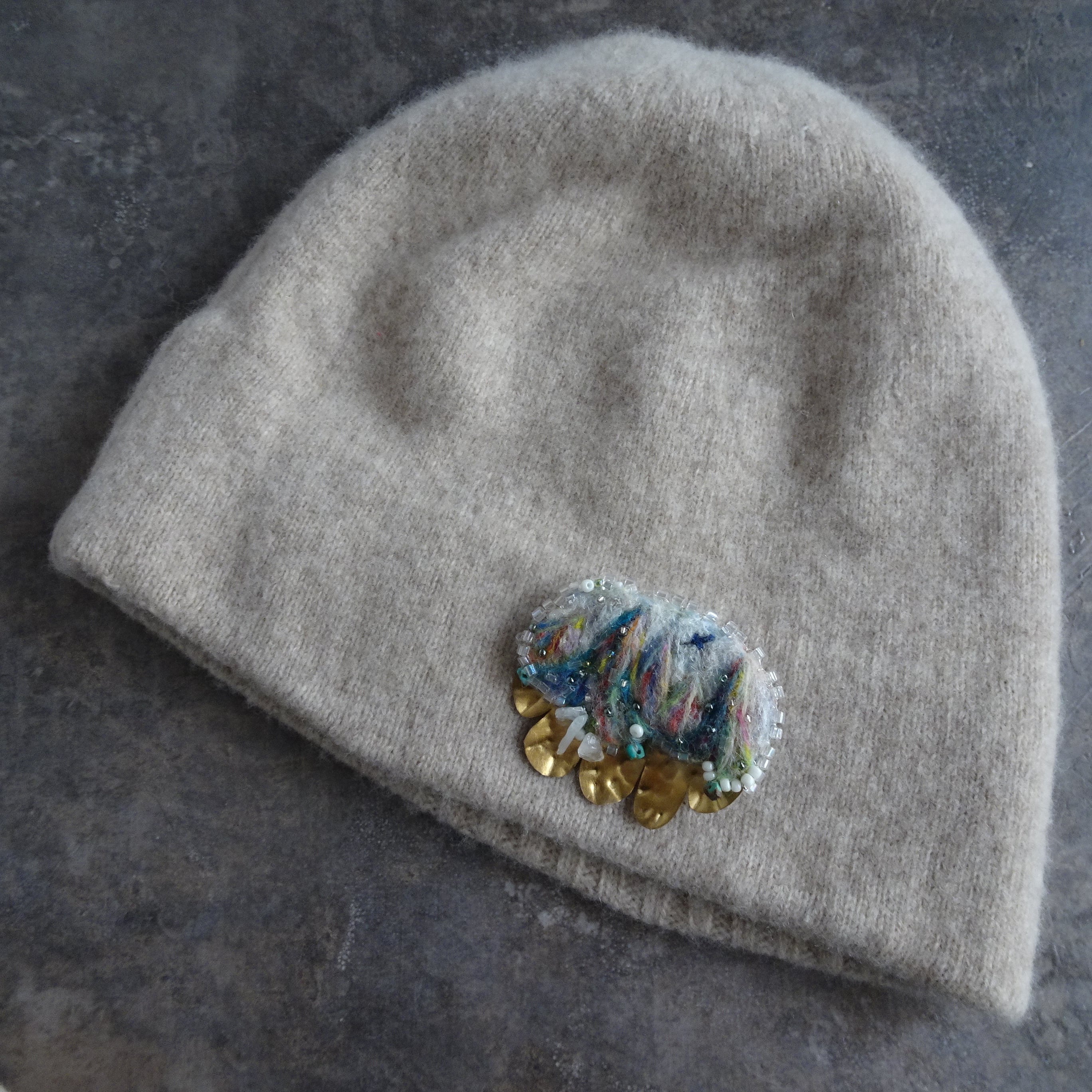 羊毛画ブローチにこそ使いたいと決め、少しずつ集めた美しい広島ビーズを点描の様にふんだんに刺繍し、羊毛画に豊かな表情を彩ります。