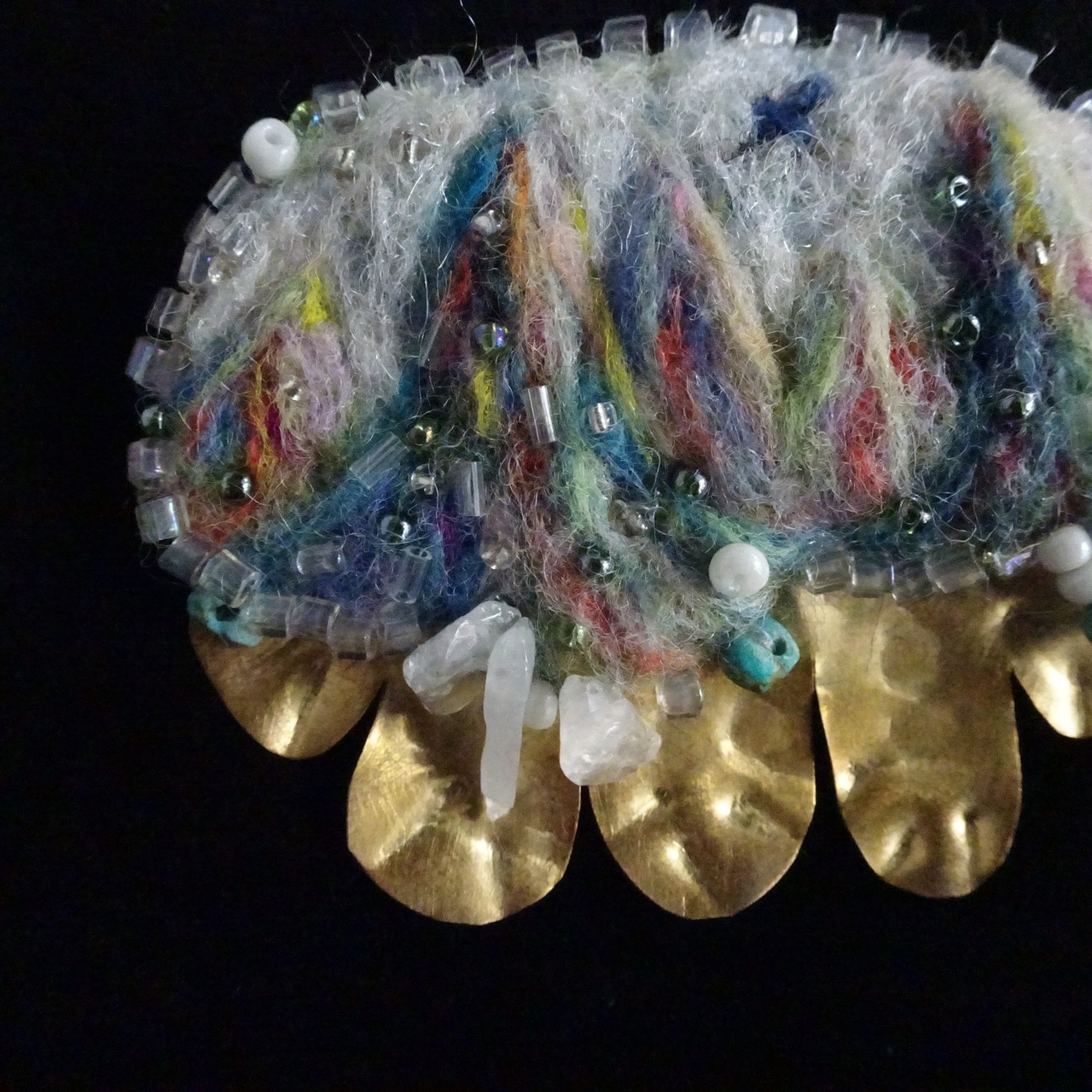 羊毛、ヴィンテージ広島ビーズ、水晶、ターコイズ、真鍮、本革