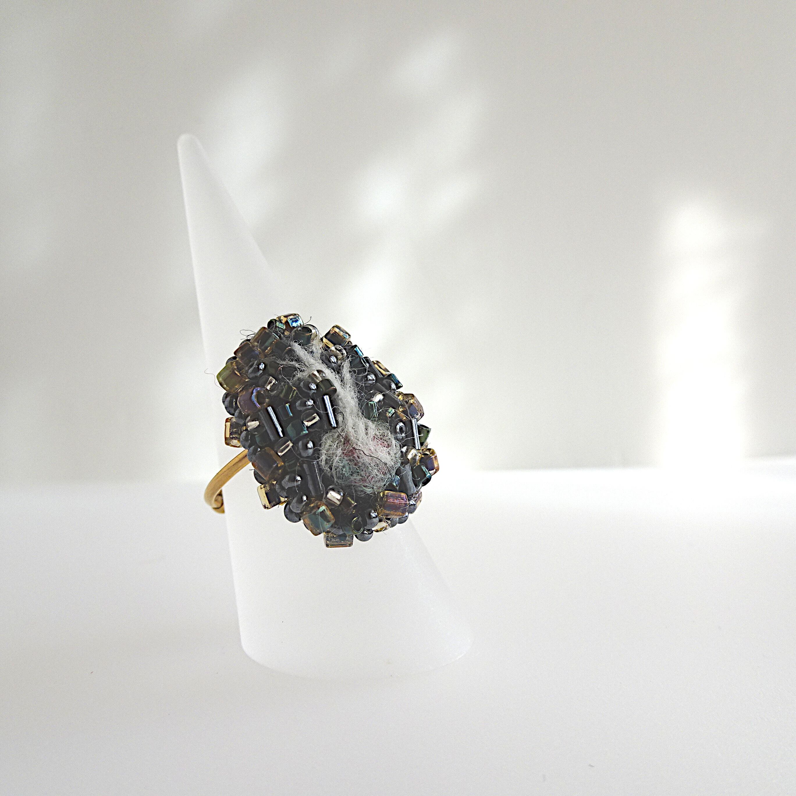 色と線が幾重にも重なり形を成して、奥深く静謐な世界を描き出す羊毛画。物語の一片のような小さくも愛おしい世界を暮らしに添える指輪です。