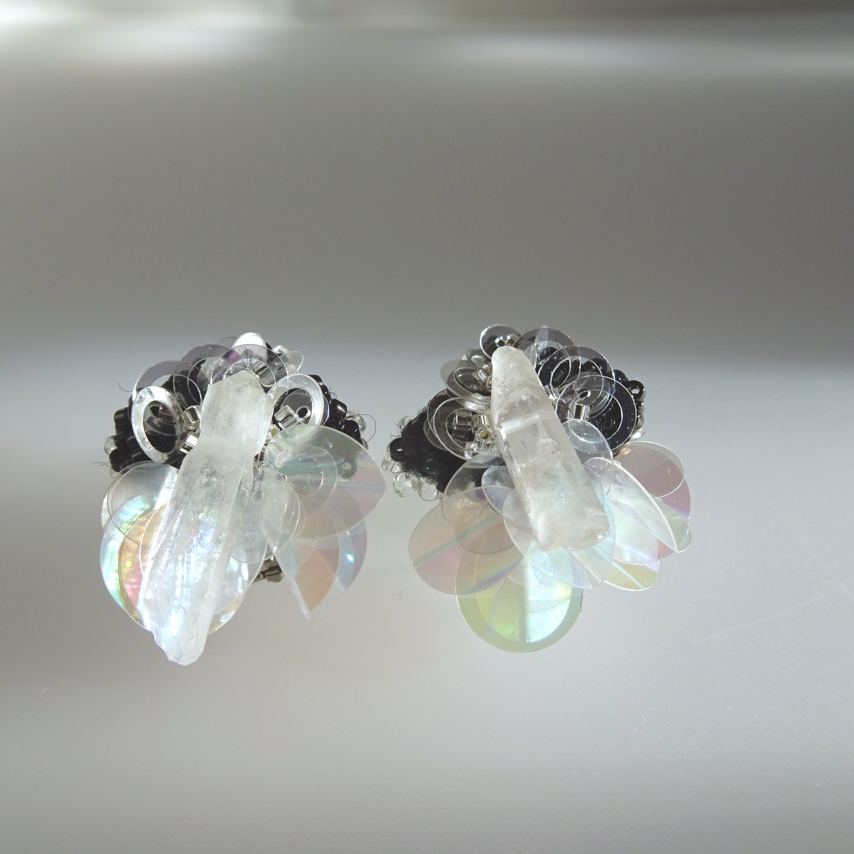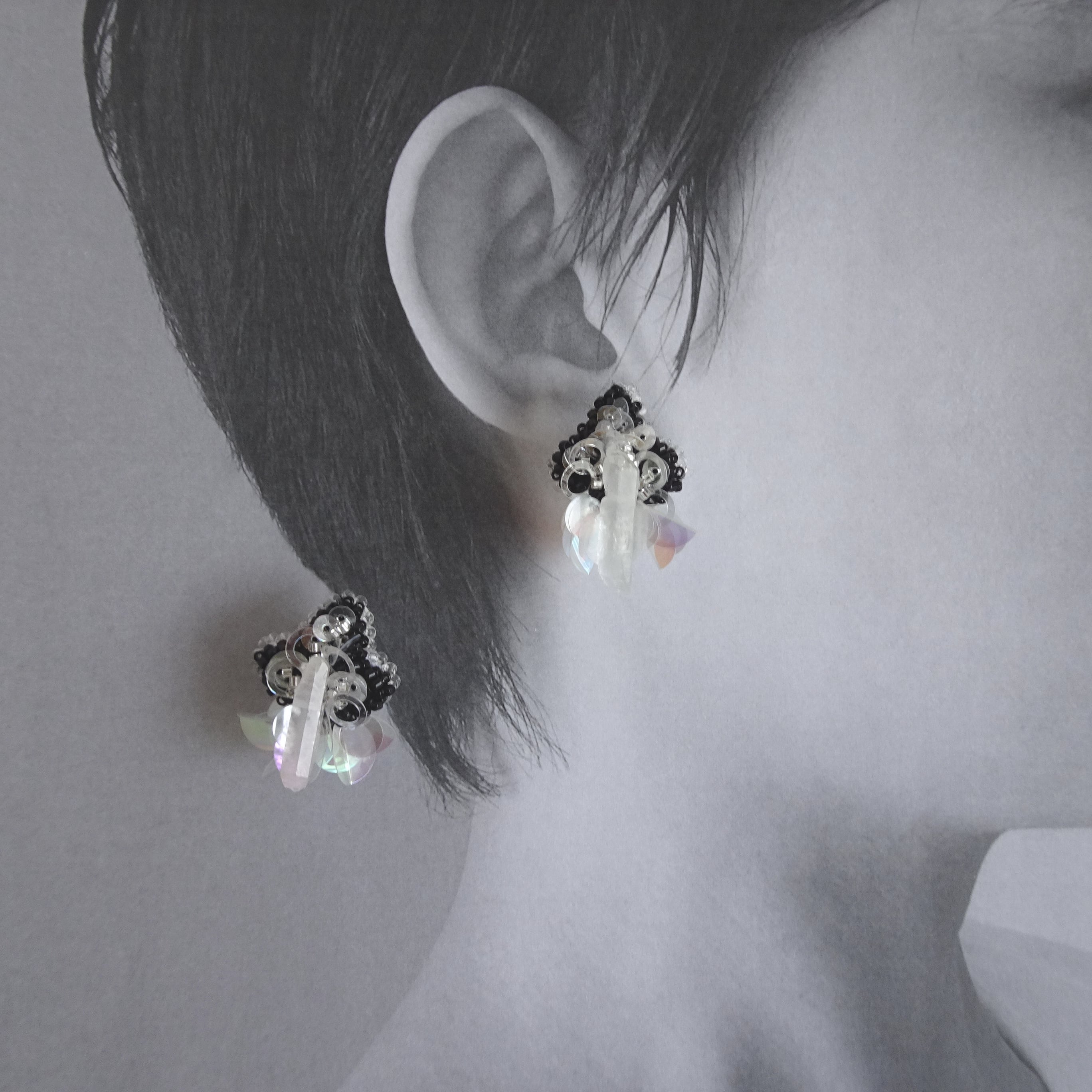 すっと立つように輝く氷柱水晶がイヤリングに気品を添えます。