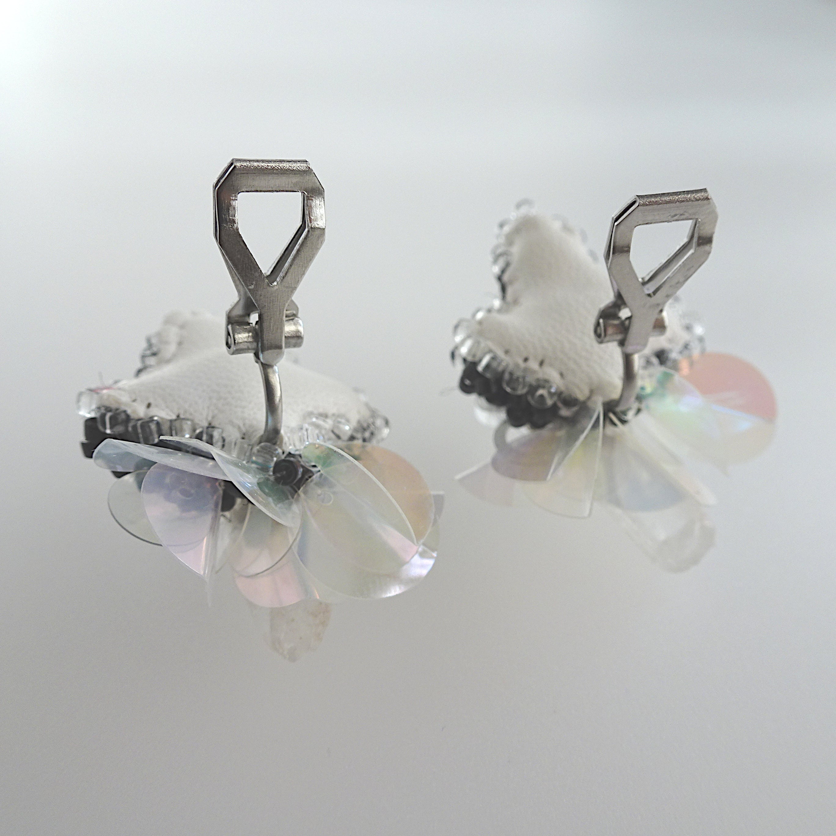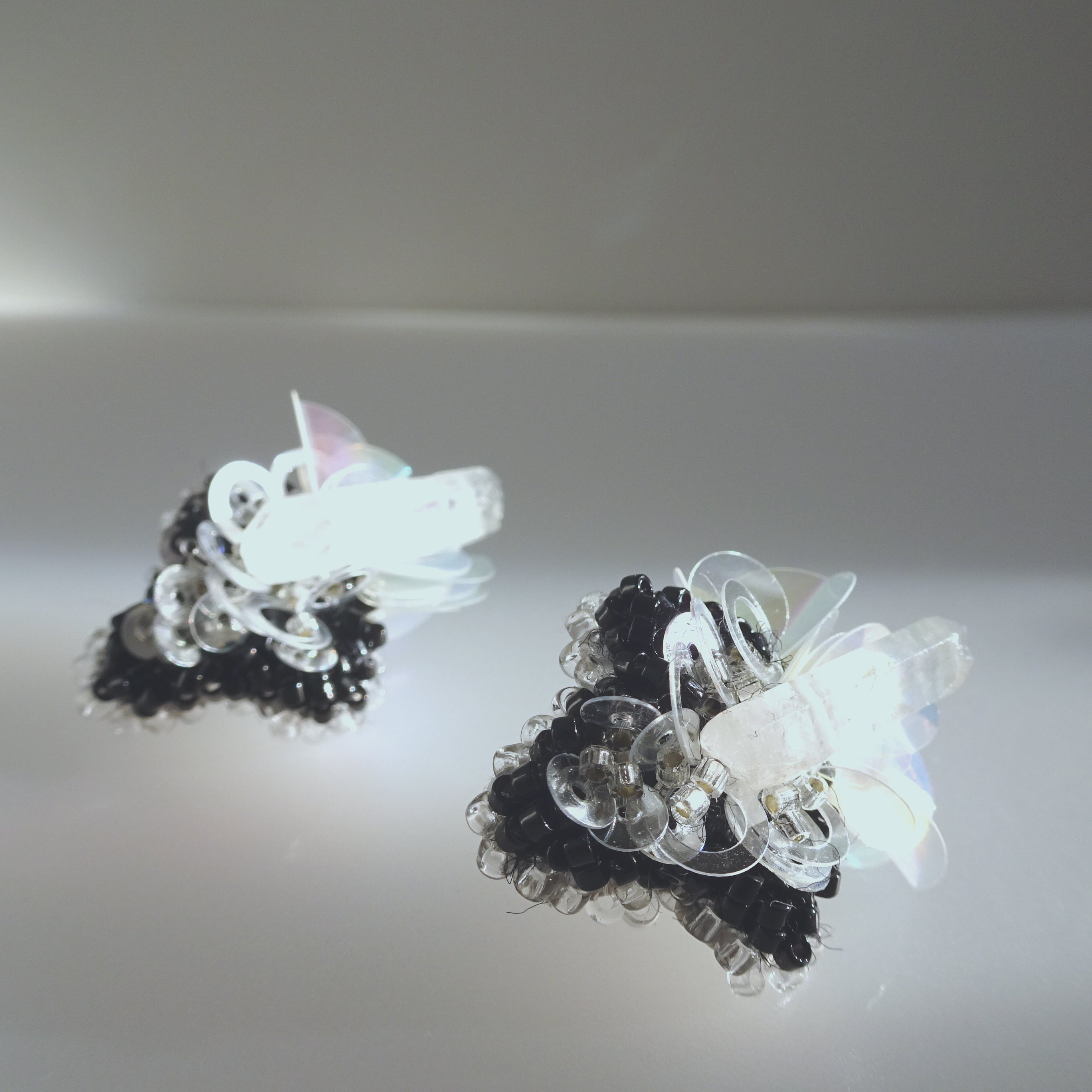 中央に縫い集めたクリアカラーのスパンコールが、お顔の動きに合わせて光を反射します。