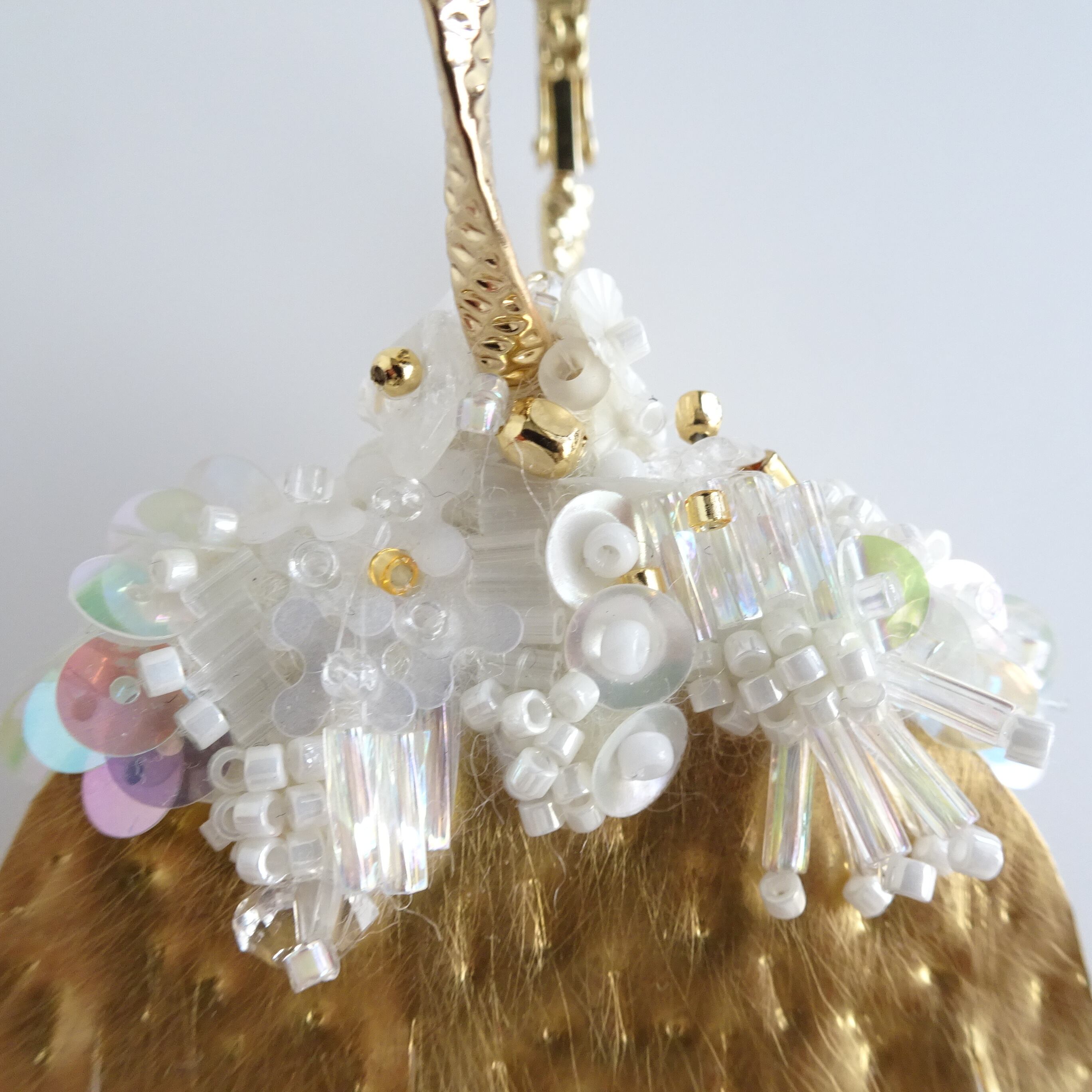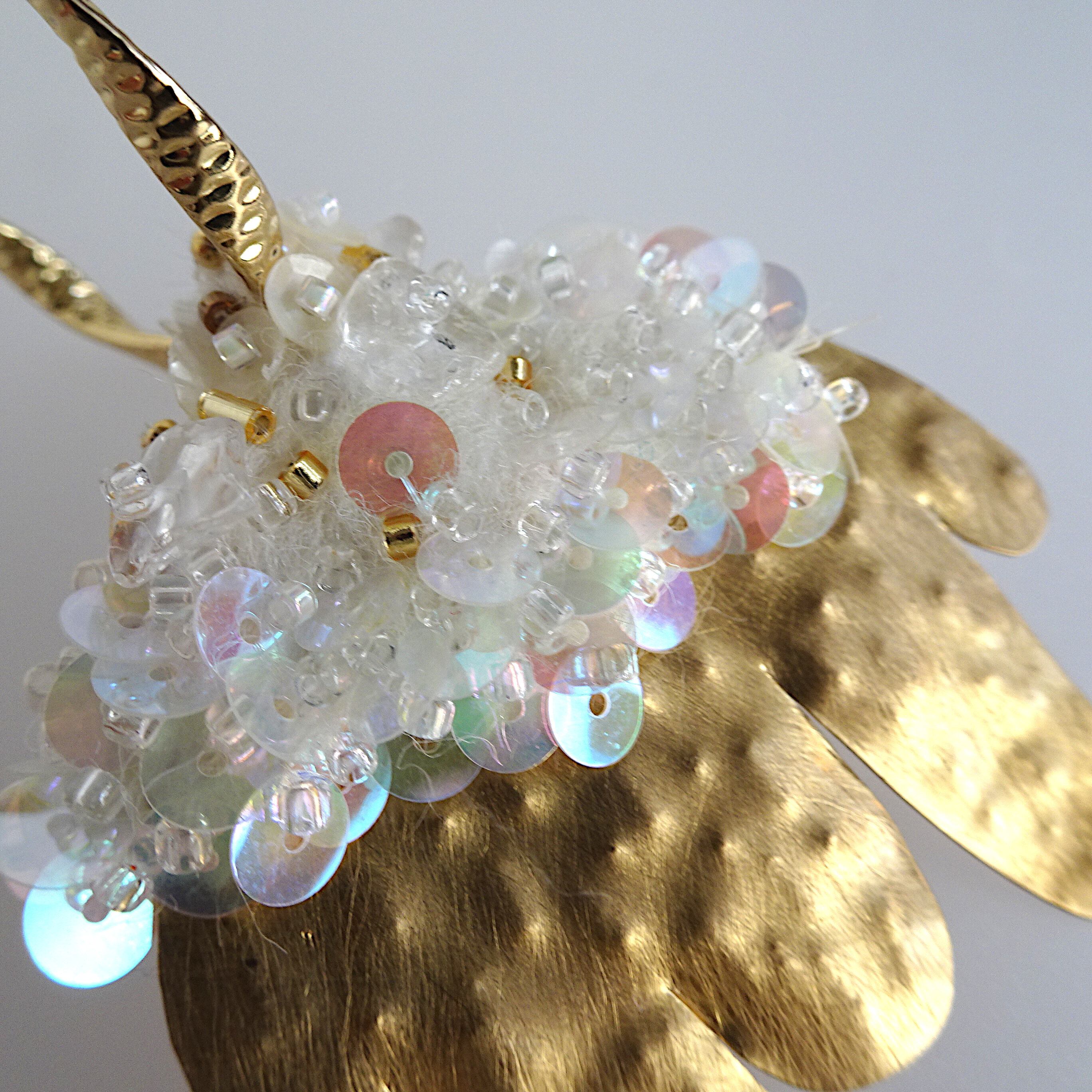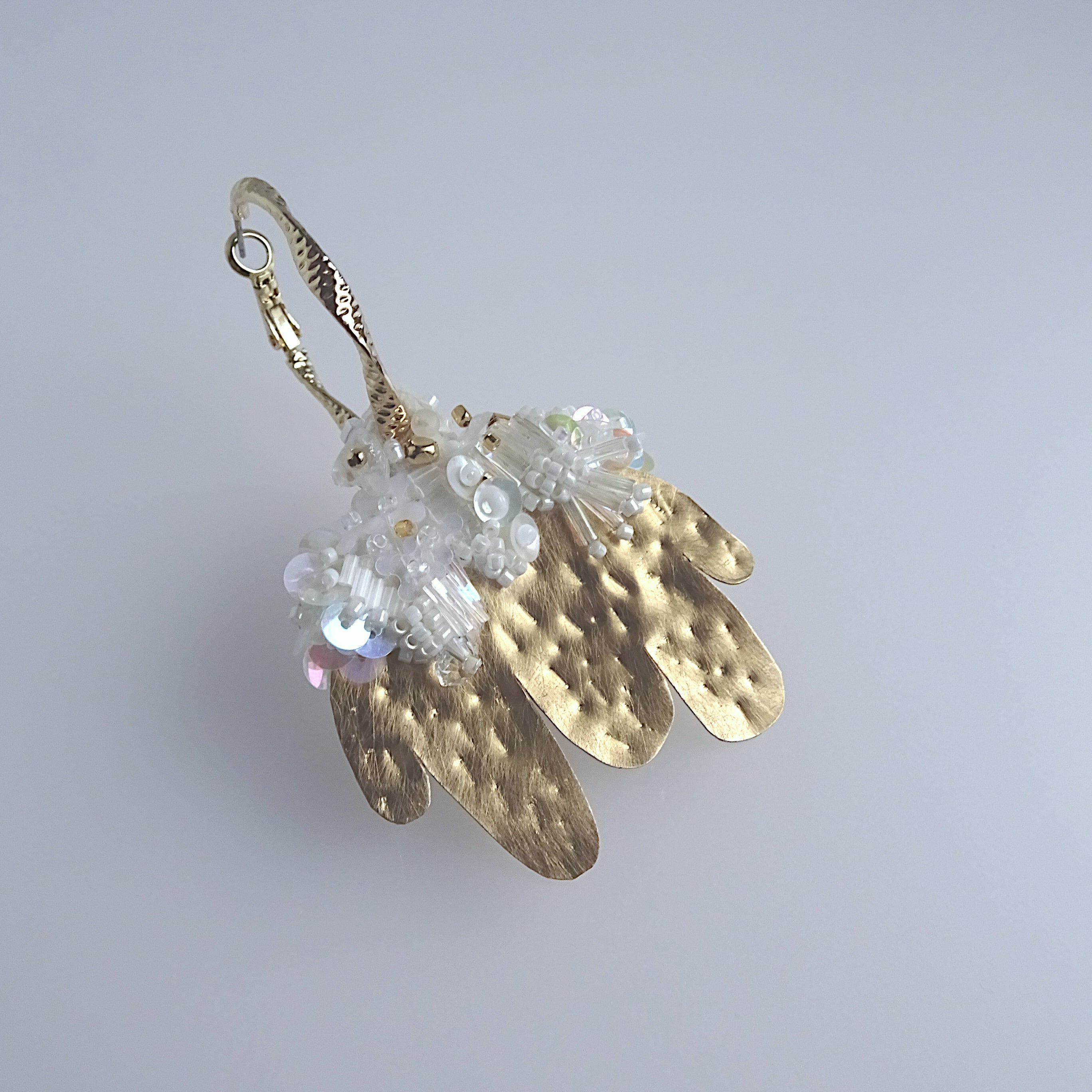 のびやかな四肢を表現する真鍮と、ビーズや天然石の立体刺繍を組み合わせた片耳ピアス。