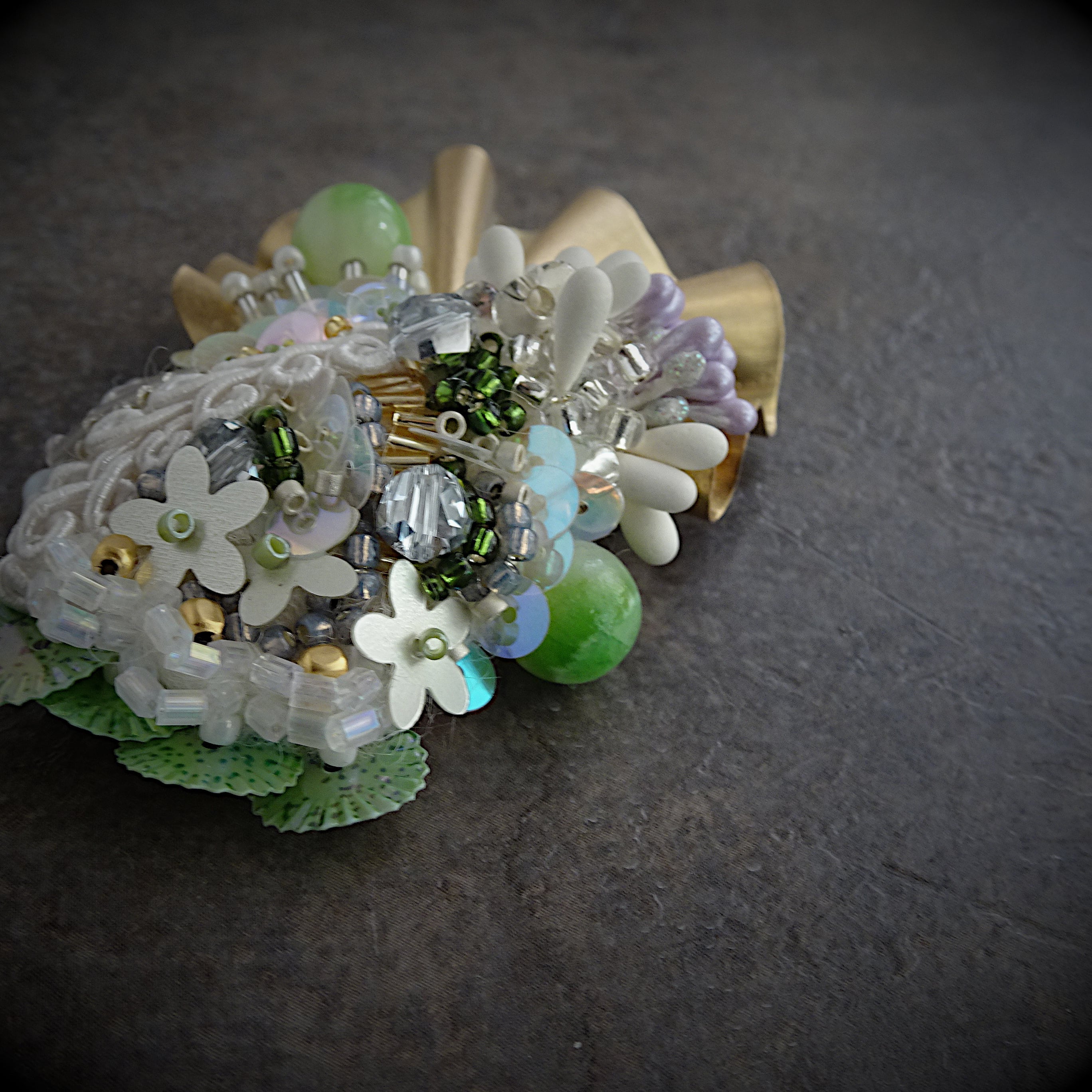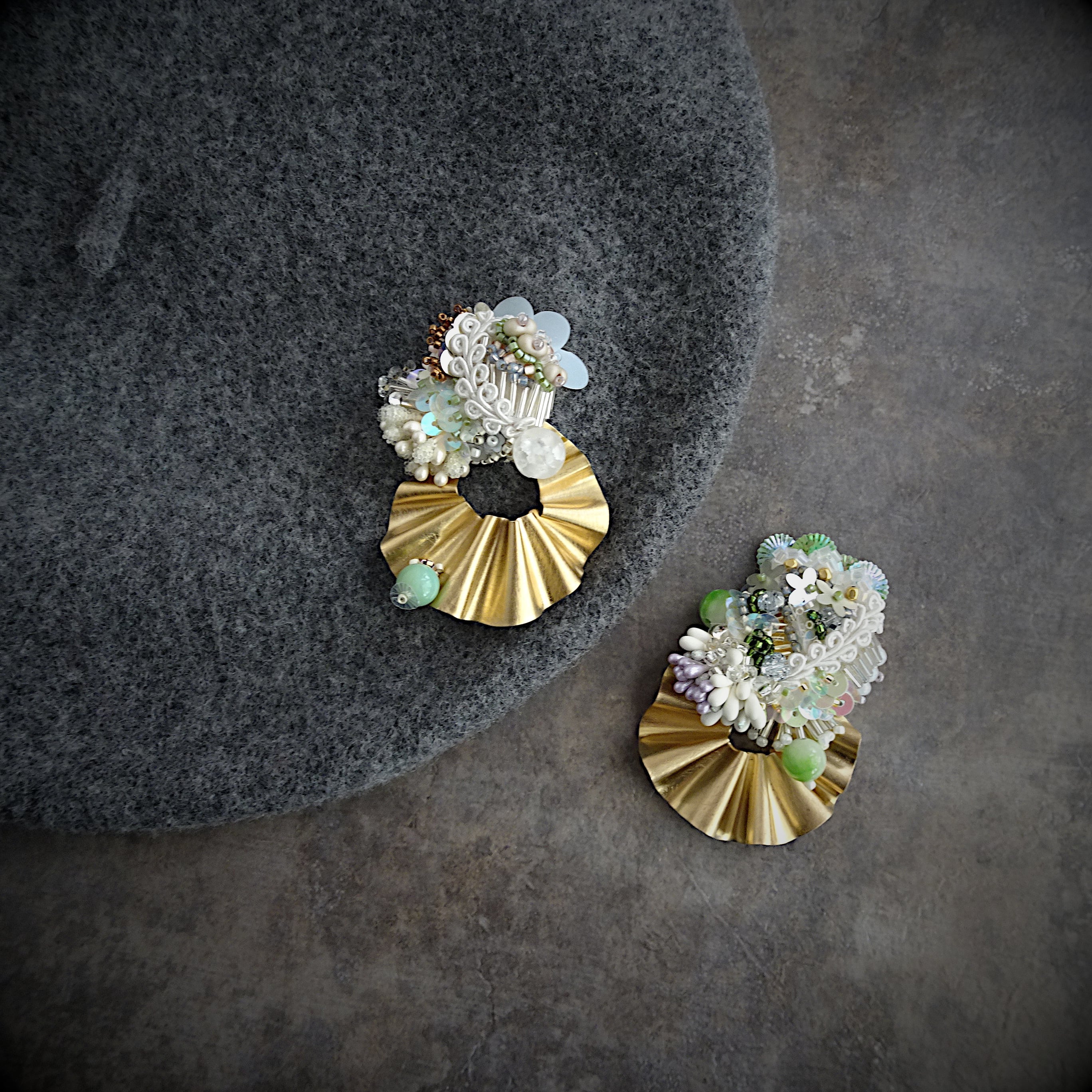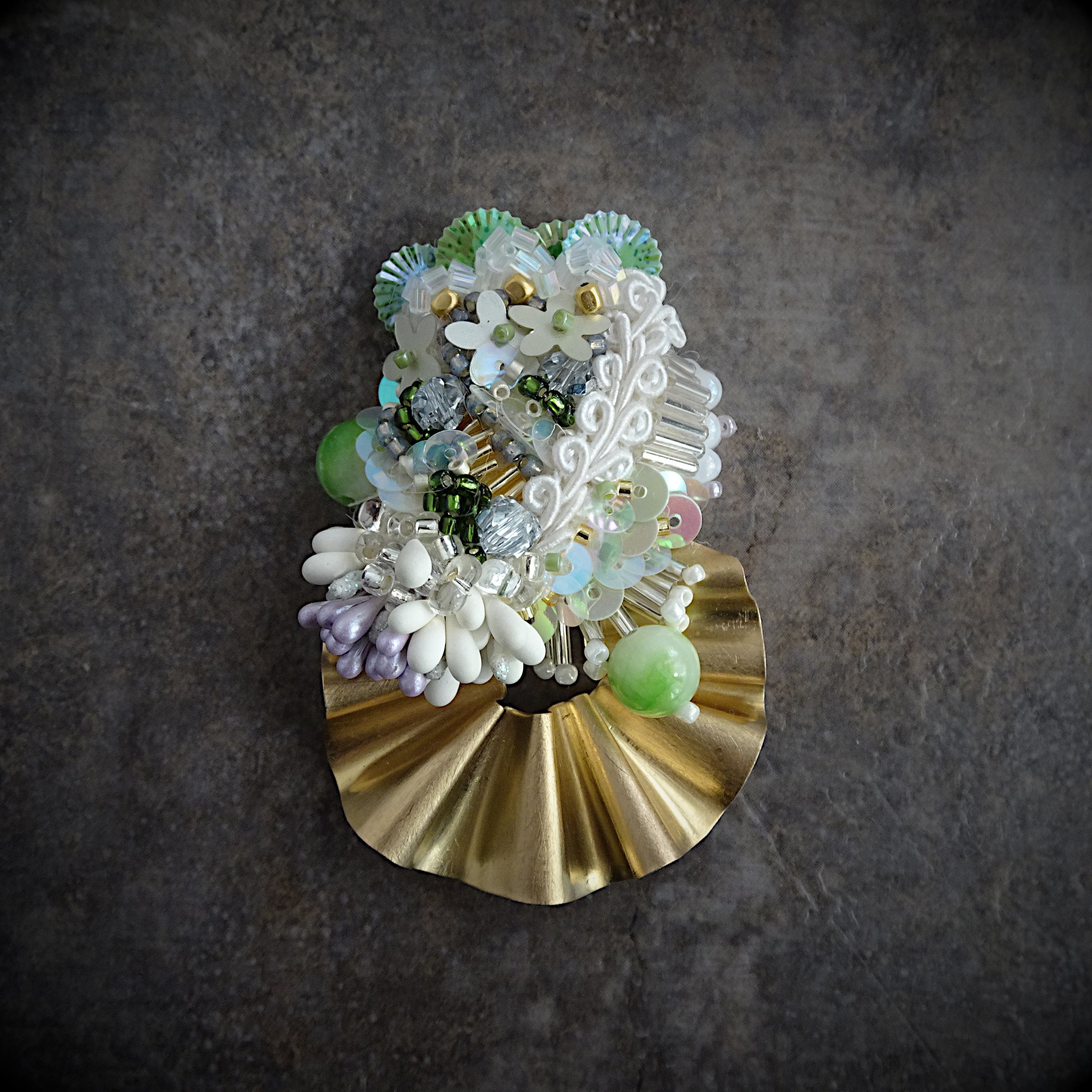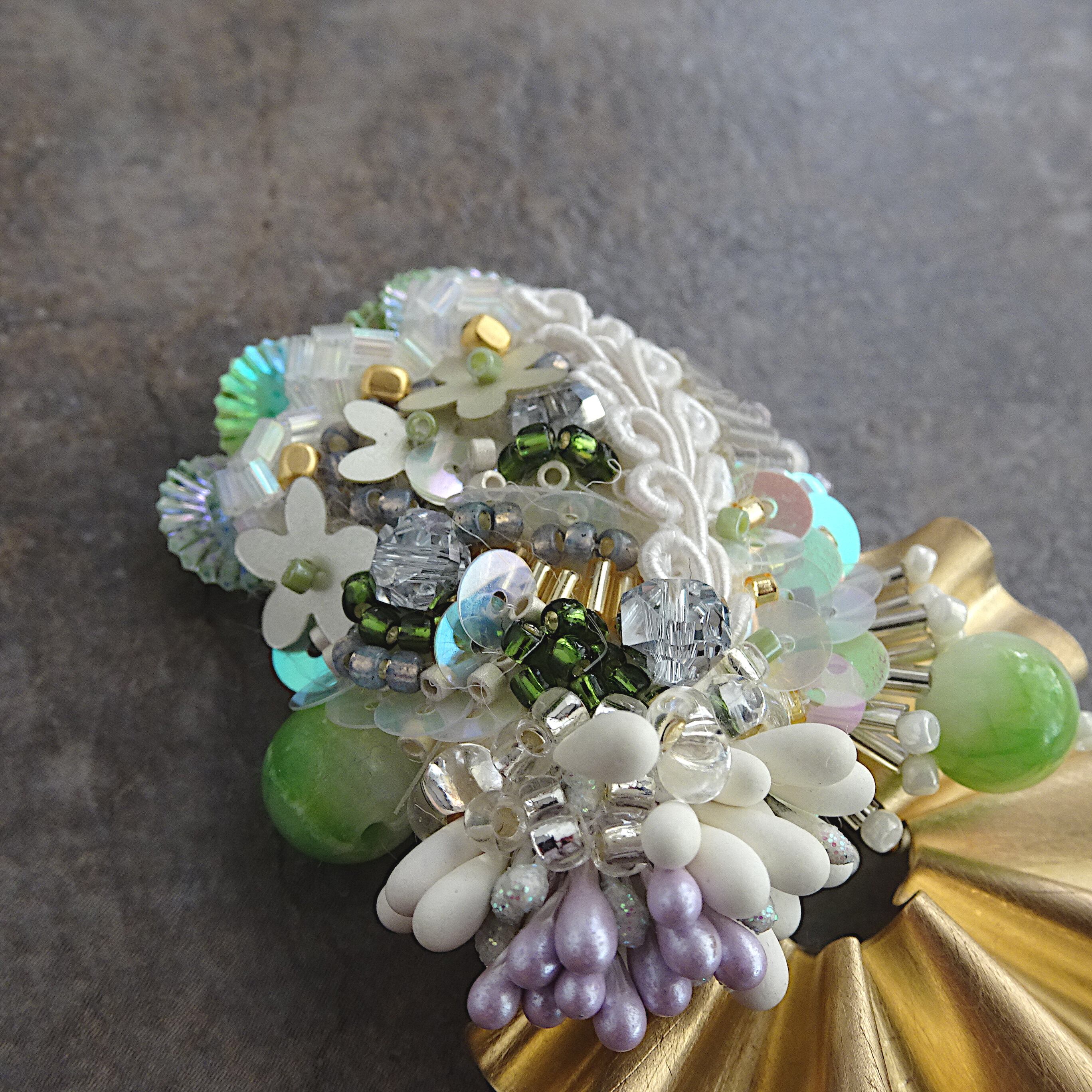 ビーズや天然石の立体刺繍を組み合わせたブローチ。