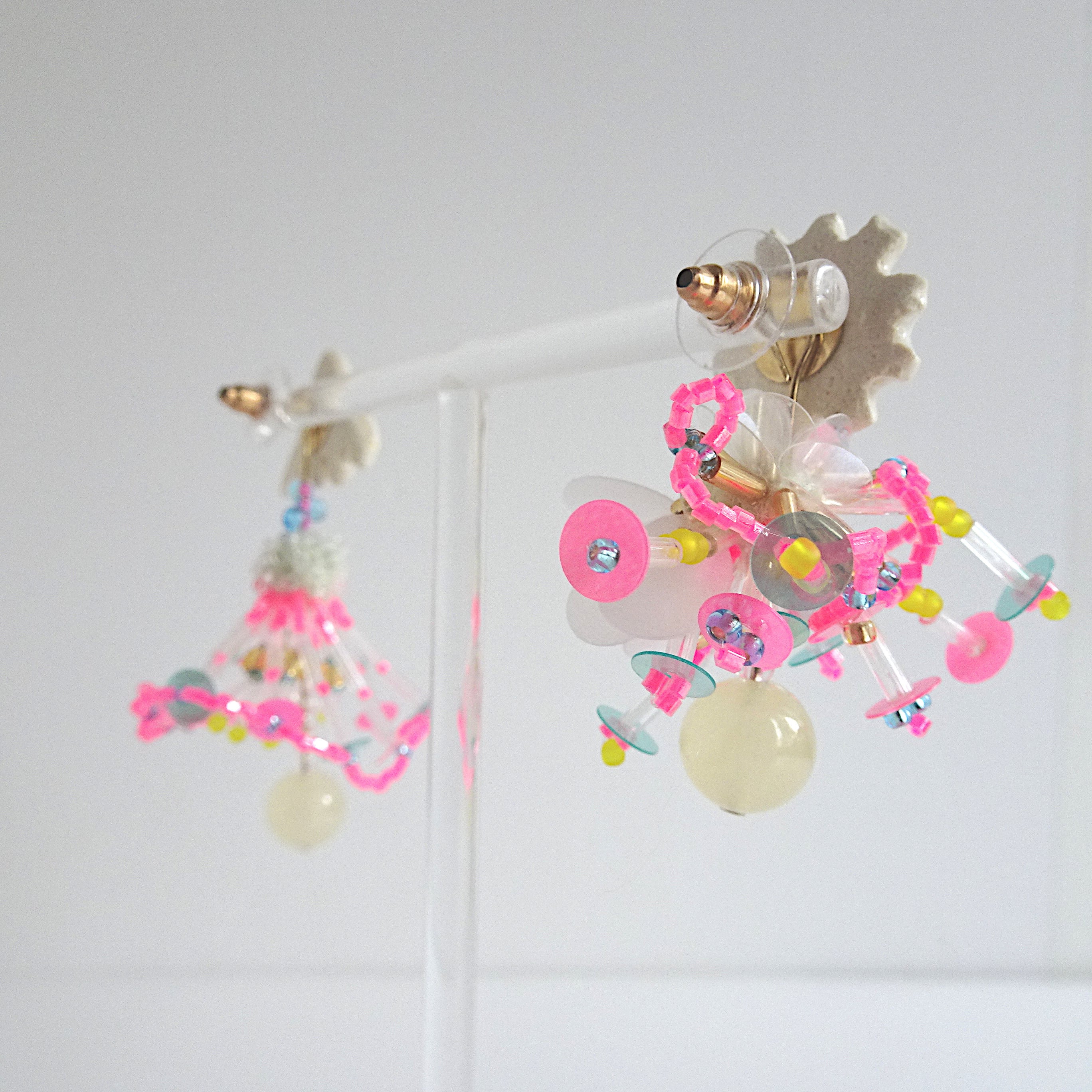 左右でデザインの異なる陶器やビーズ、天然石を重ね